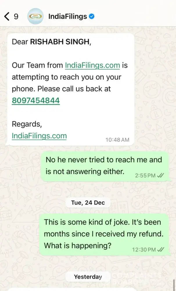 Indiafilings: all reviews are fake. Fake company. Befooling people. Charging and not providing any services. Followed up 100 times for refund. Numbers of frauds:+91 7397 483 575, +91 6384 498 636, +91 85912 00242. Frauds and cheats run this company. Don't get into their trap. They will not refund anything but keep on giving one or the other excuse. Shameless fraudsters. They should be behind bars. India filings people are thugs.