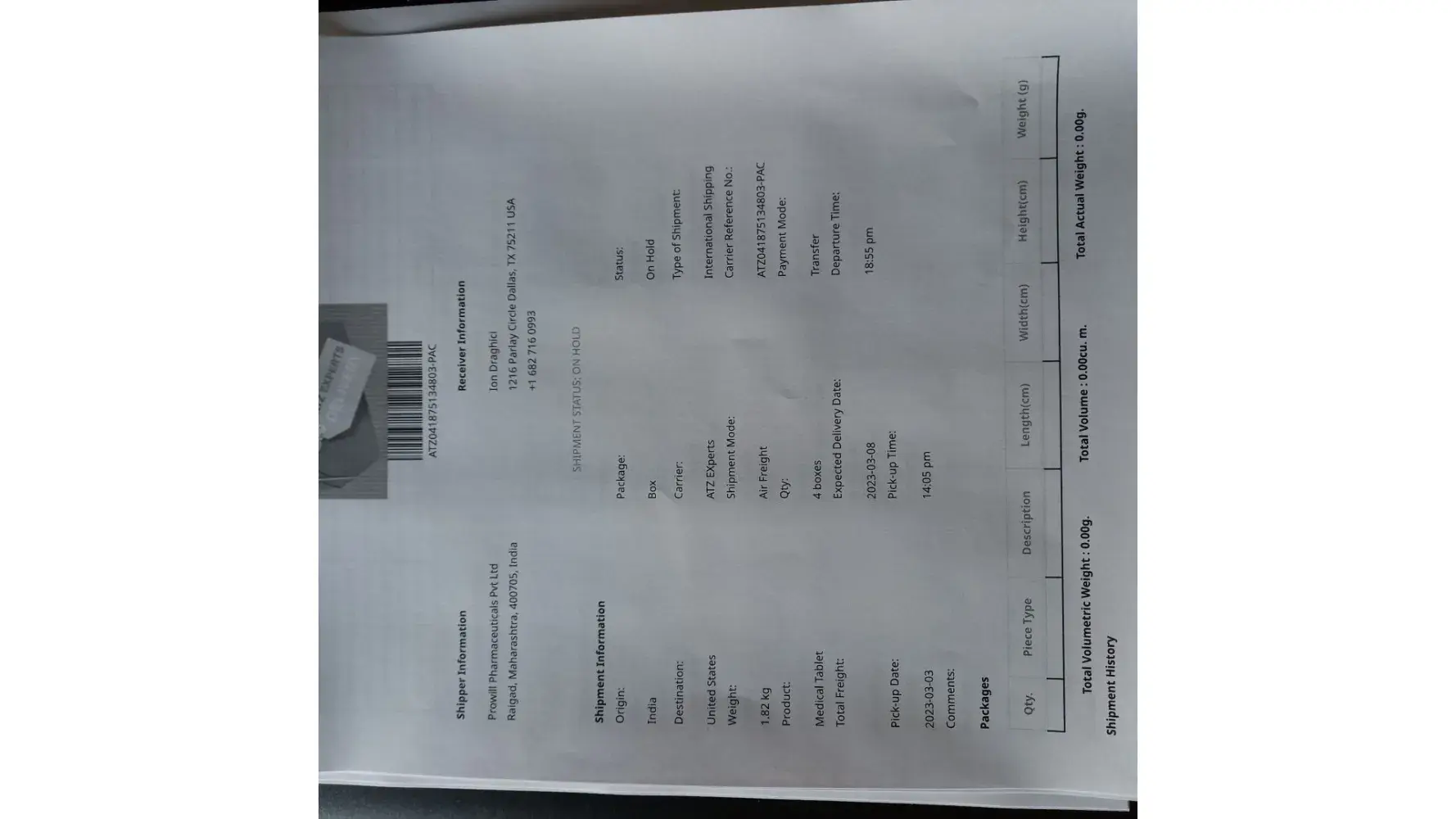Paid $ 2400 for 4 bottles, each 56 tablets .I received tracking number ATZ041875134803-PAC for a package to be delivered to: