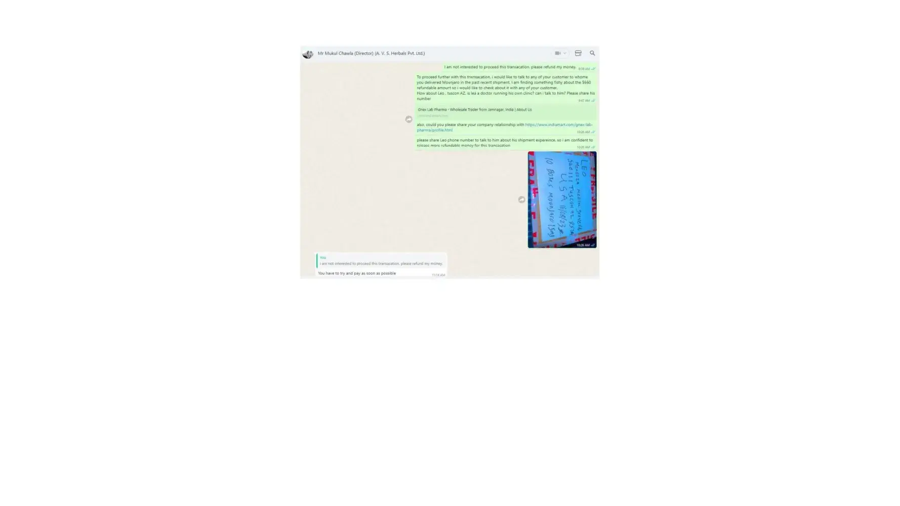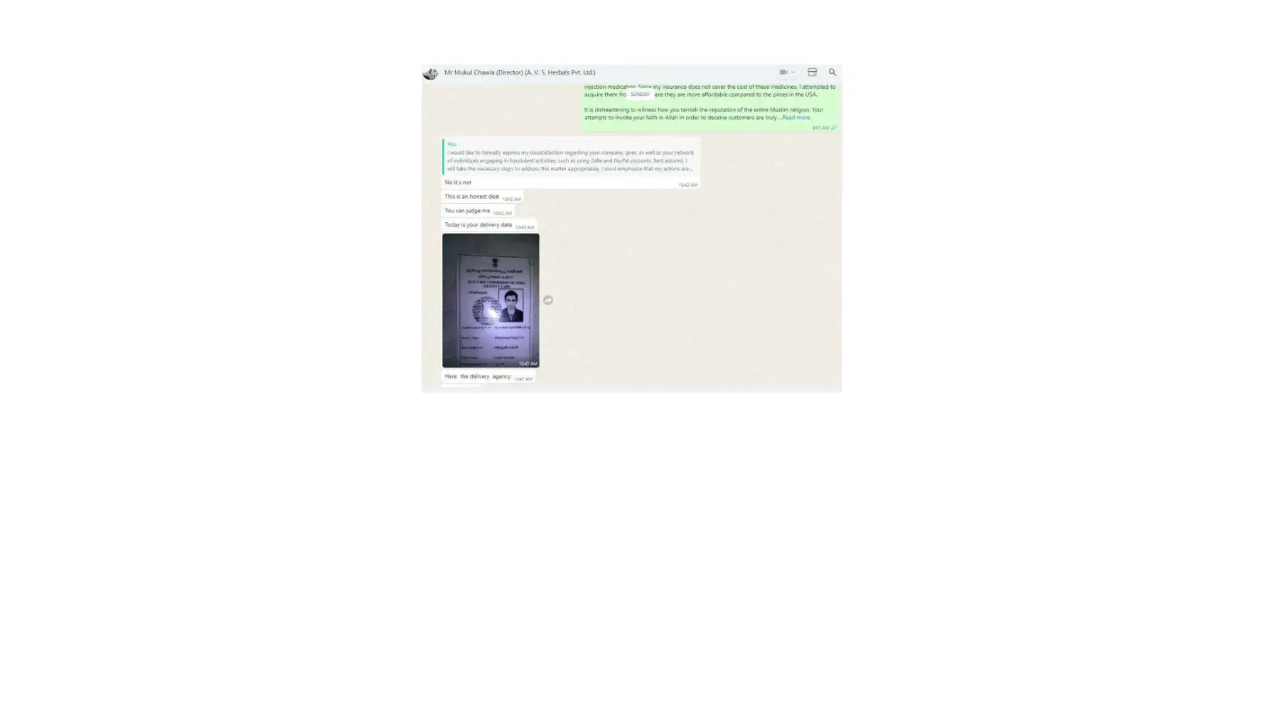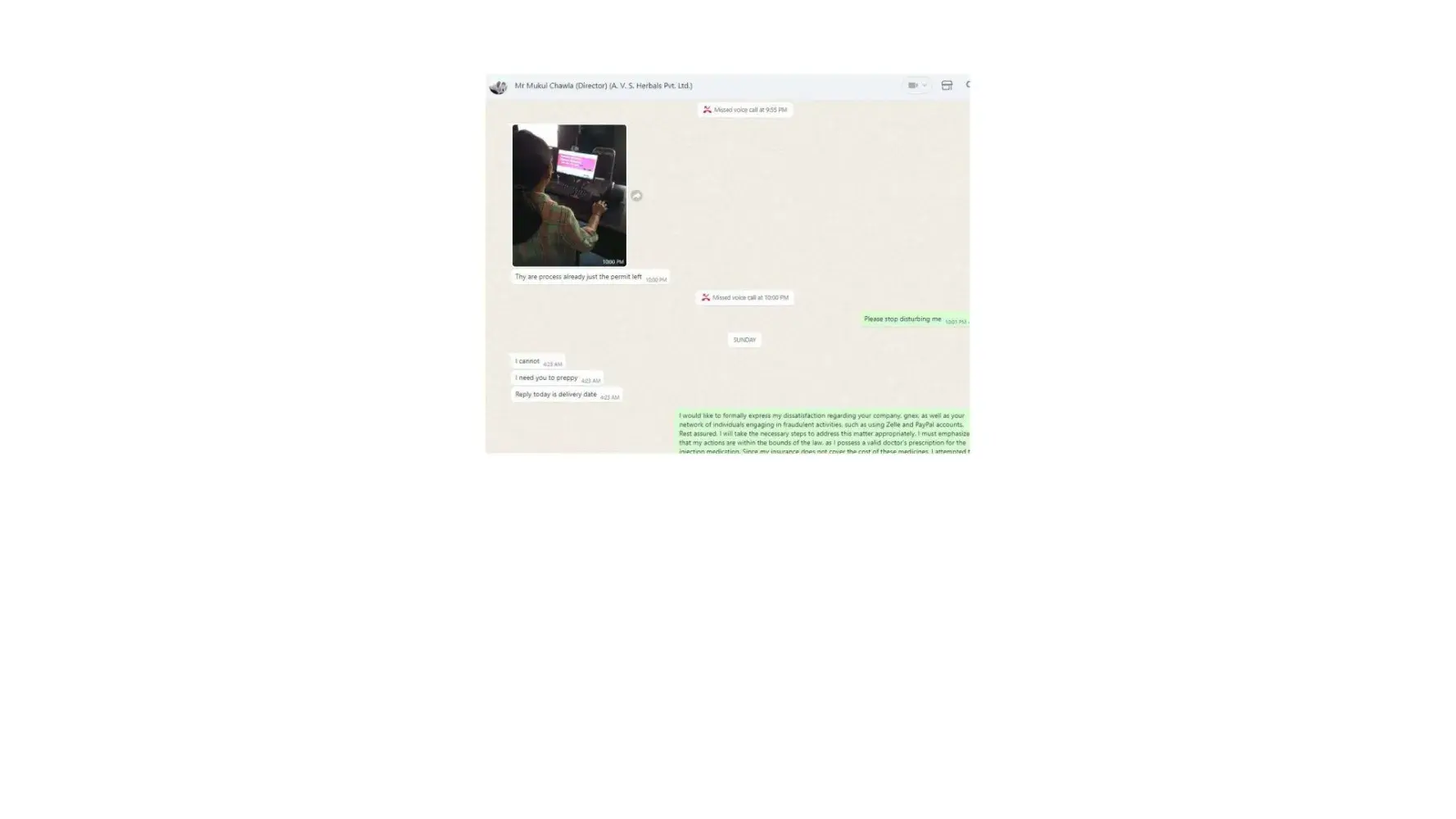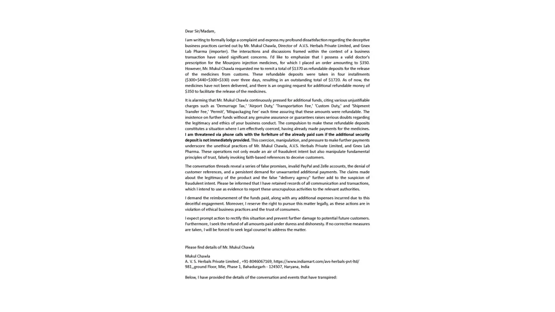 Dear Sir/Madam, I am writing to formally lodge a complaint and express my profound dissatisfaction regarding the deceptive business practices carried out by Mr. Mukul Chawla, Director of A.V. S. Herbals Private Limited, and Gnex Lab Pharma (importer). The interactions and discussions framed within the context of a business transaction have raised...