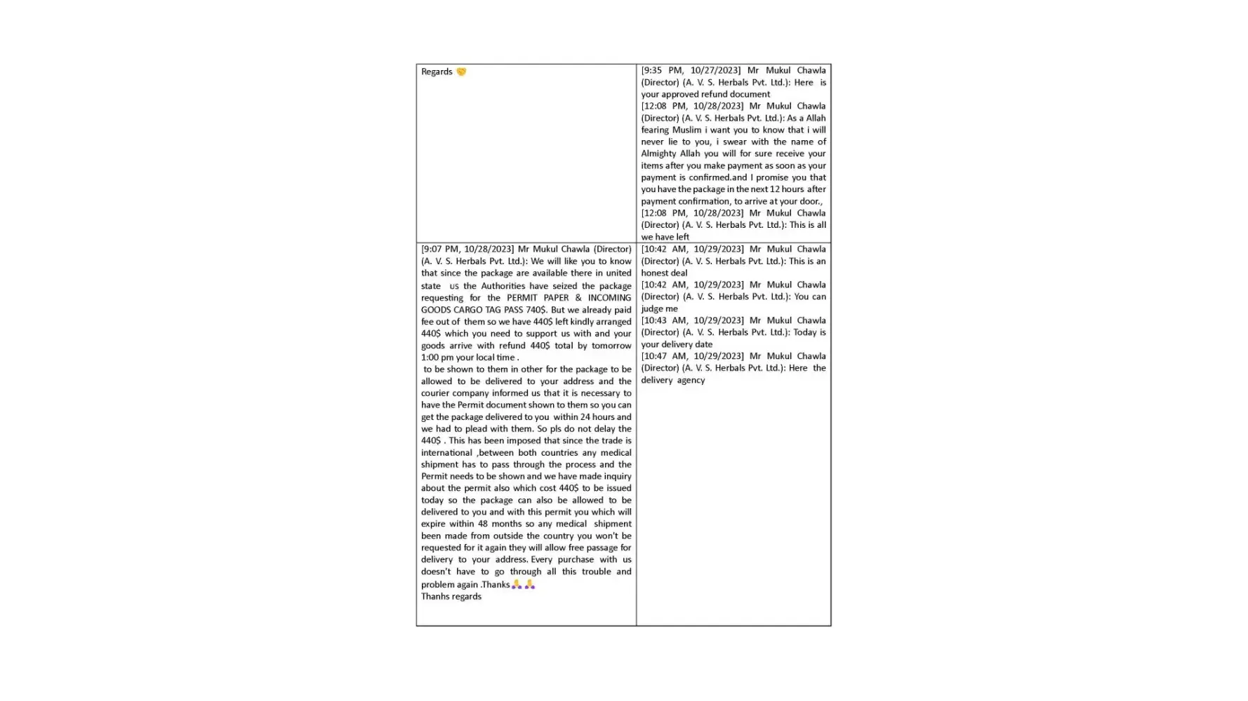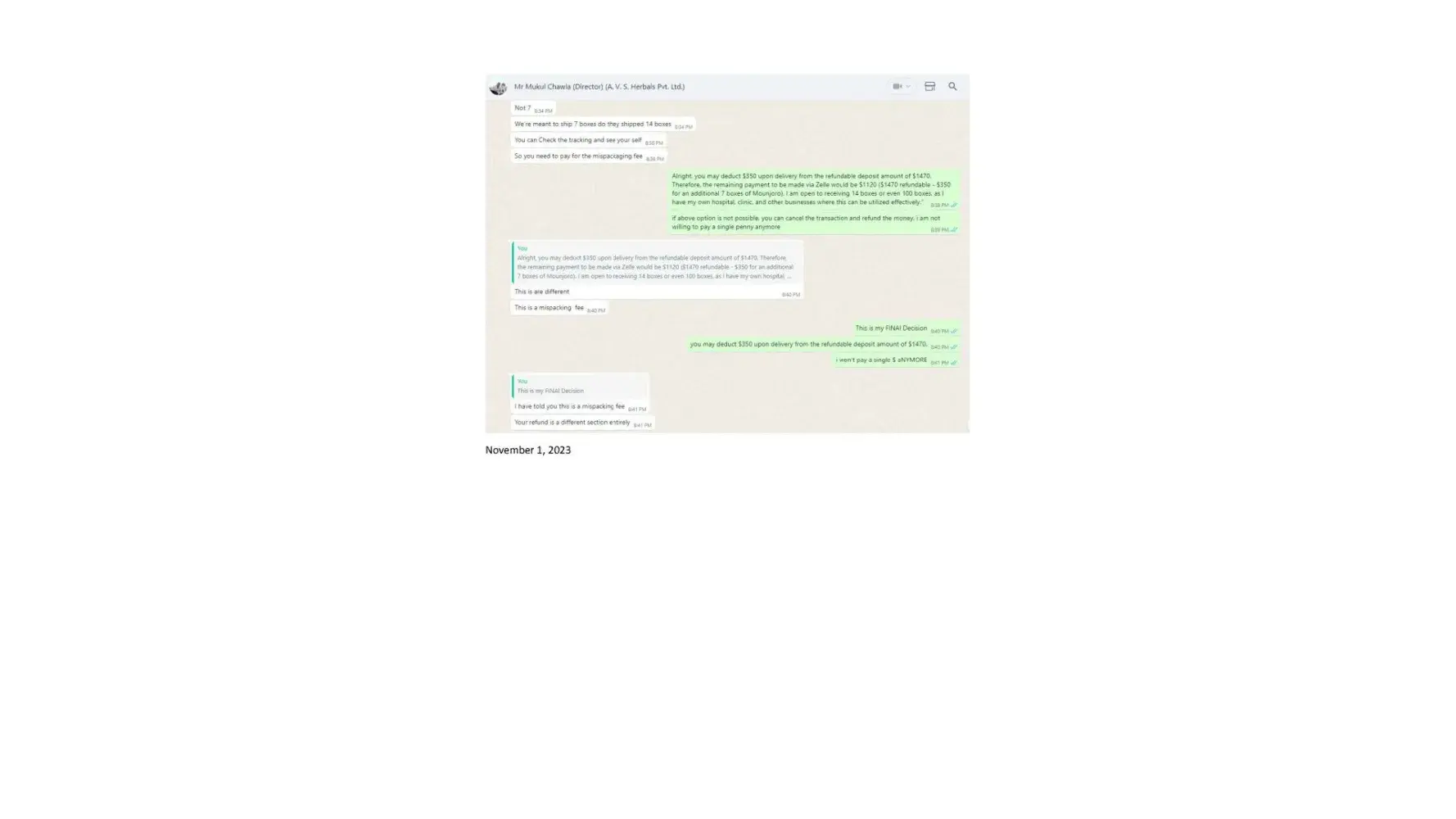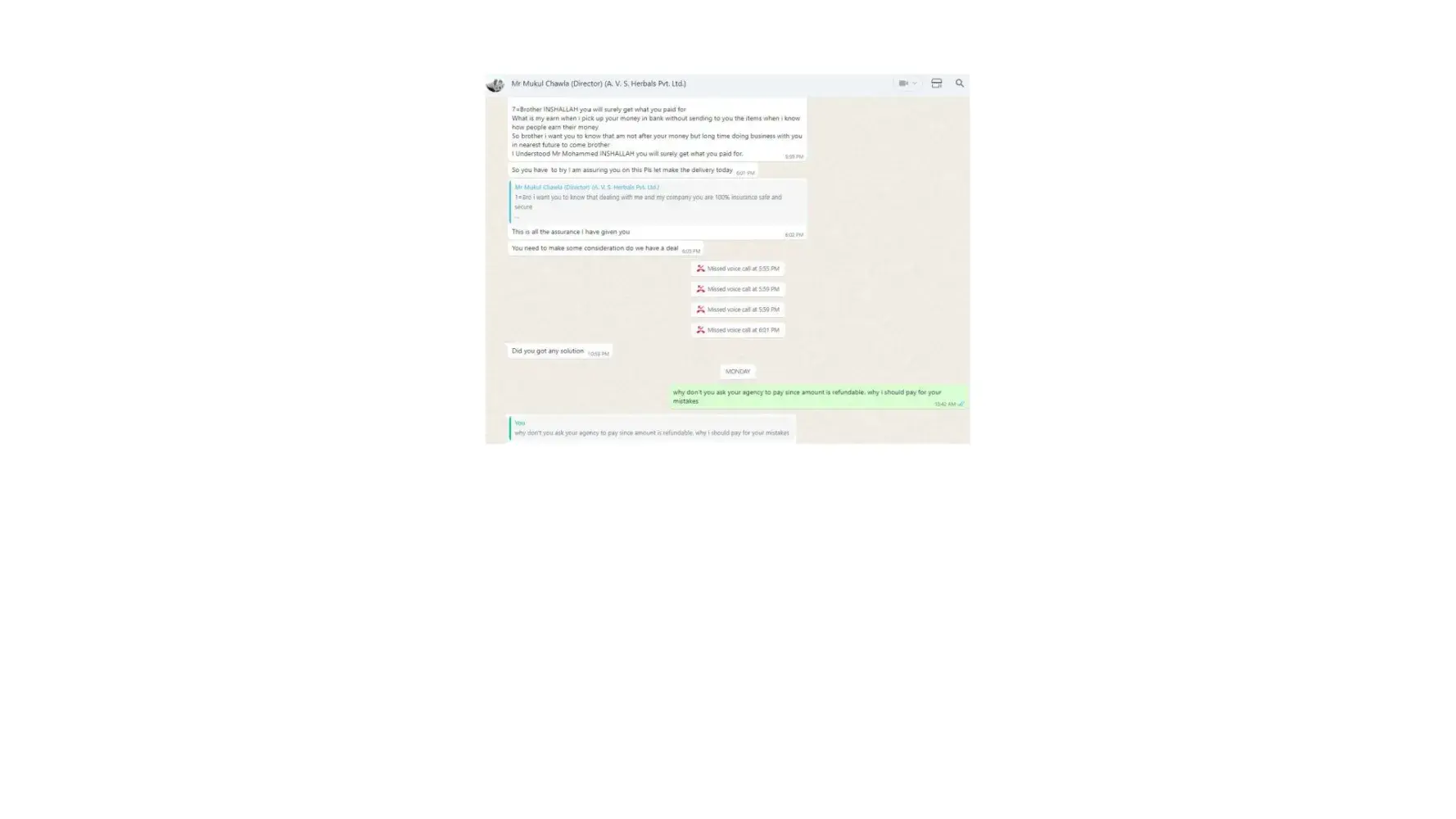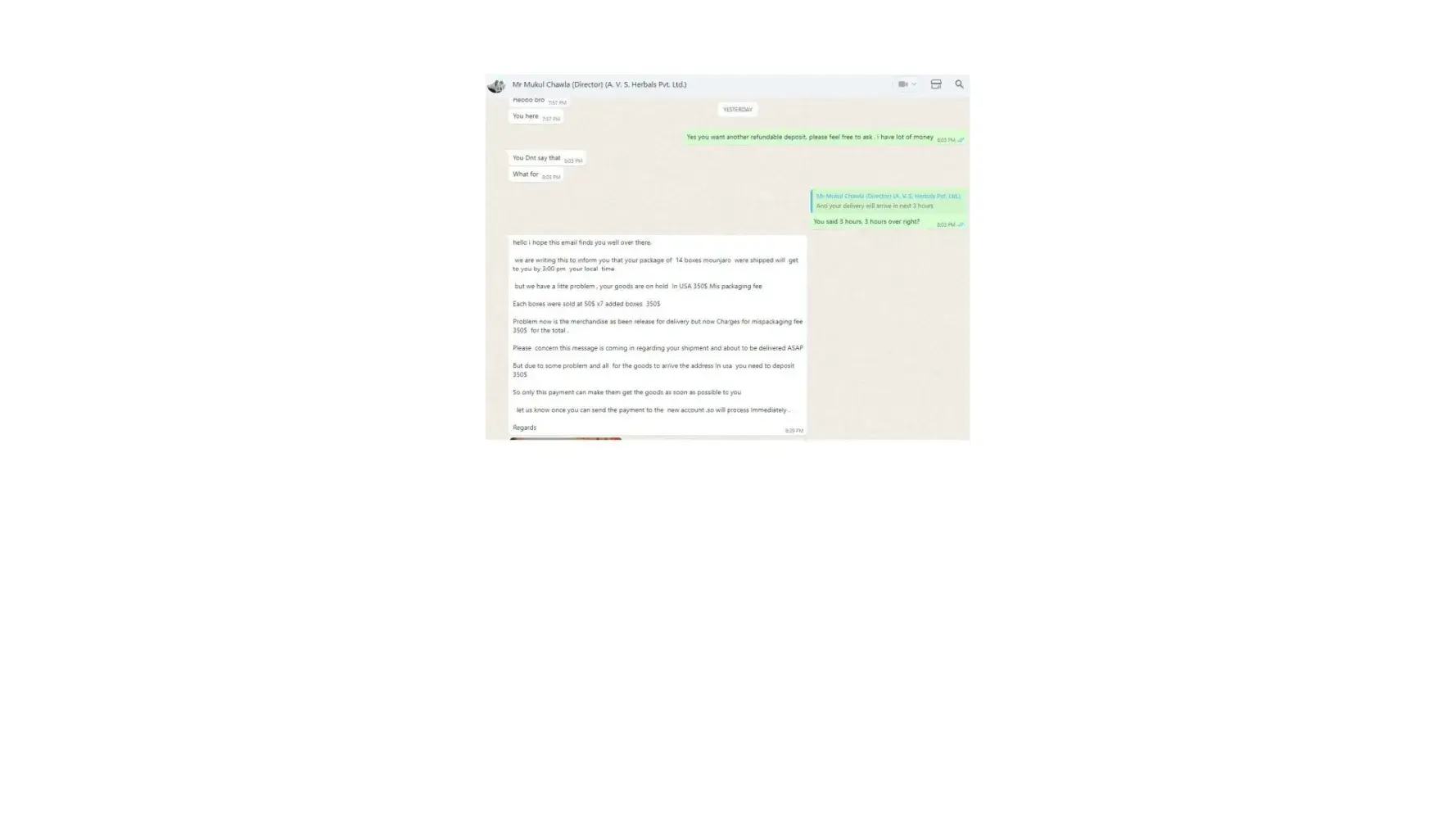 Dear Sir/Madam, I am writing to formally lodge a complaint and express my profound dissatisfaction regarding the deceptive business practices carried out by Mr. Mukul Chawla, Director of A.V. S. Herbals Private Limited, and Gnex Lab Pharma (importer). The interactions and discussions framed within the context of a business transaction have raised...