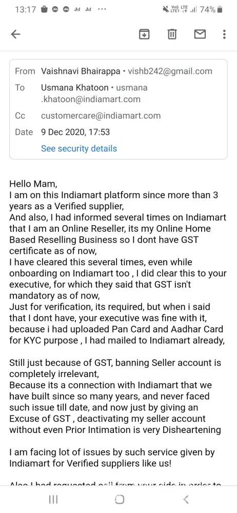 Because its a connection with Indiamart that we have built since so many years, and never faced such issue till date, and now just by giving an Excuse of GST, deactivating my seller account without even Prior Intimation is very Disheartening