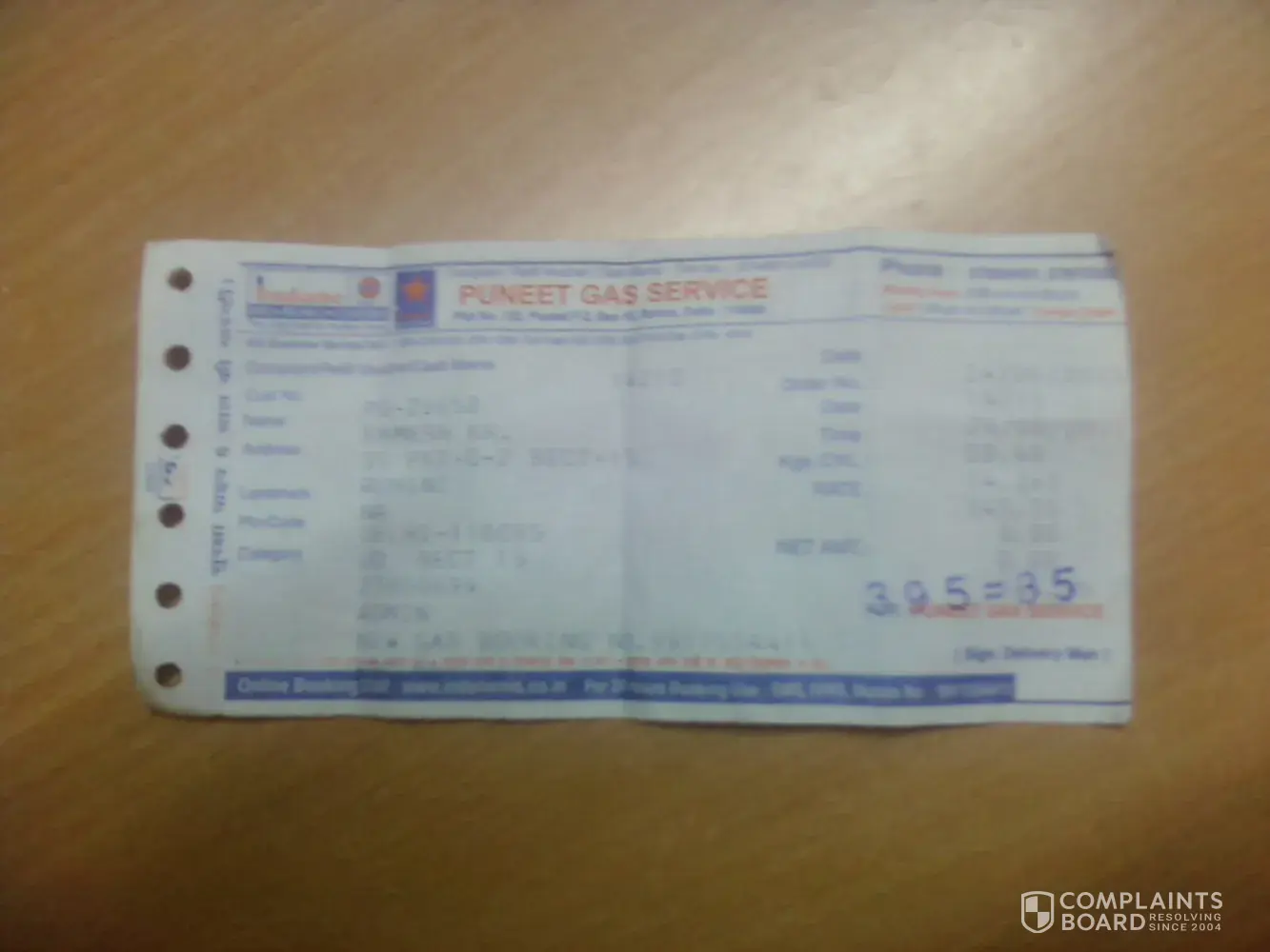 With reference to Consumer no. PG-26658, I personally visited at M/s Puneet Gas Service, 132-33, Pocket-F-2, Sector 16, Rohini, Delhi (Indian Oil Corporation Ltd, LPG Gas provider) to book my refill for LPG on 17.05.2011. But till date i.e. 22.05.2011 up to 11:00 A.M. there is no response to deliver the refill/ LPG cylinder at my residence.