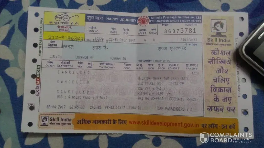refund of cancellation of ticket at city station, lucknow counter