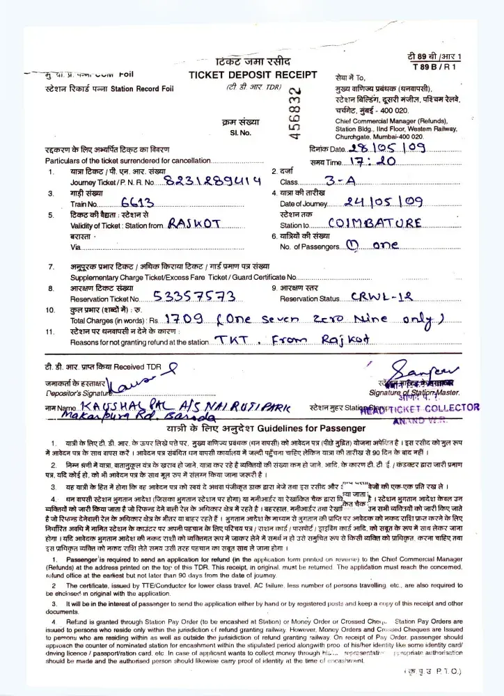 When approached the station of Egmore, Chennai. It was informed that 100 % refund will happen. Inspite, on filing TDR /cancelling on the very next day i.e. 12/10/09 only Rs. 85 /- and Rs, 299 /- respectively is credited.