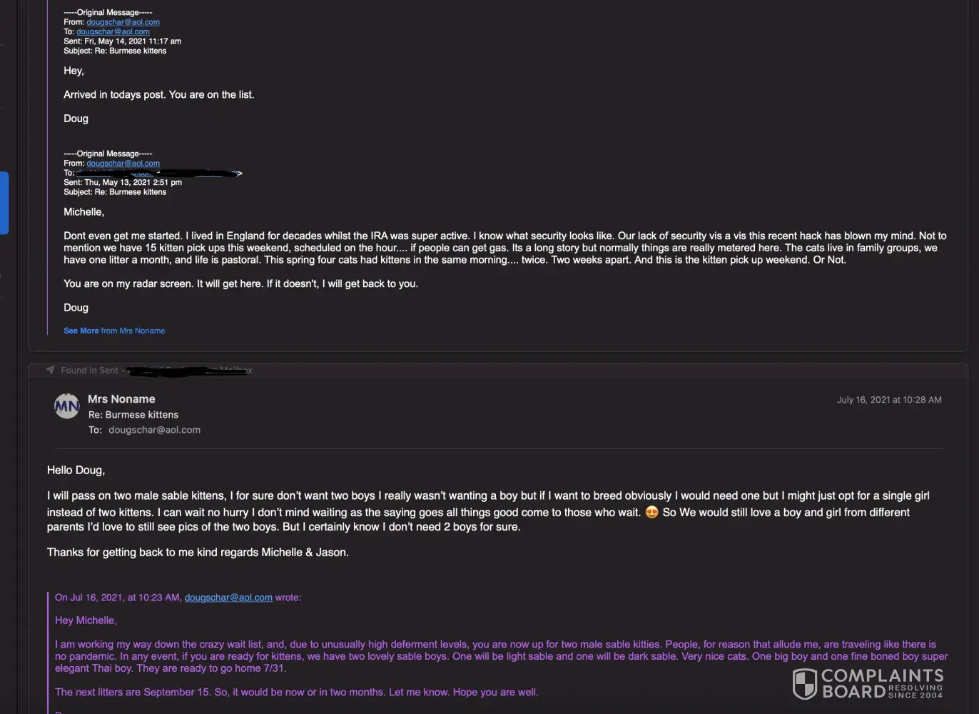 you are lucky you didn't get scammed as I did. My cat died at 10 months and had health issues from day 1 which he brushed off as nothing. Bordatella and Calici virus aren't nothing. I spent $8000 on his medical bills that no insurance would touch based on this was a pre-existing disease from the cattery. I have had no response from Doug or anyone there. Only the vet they use who said he was sorry.