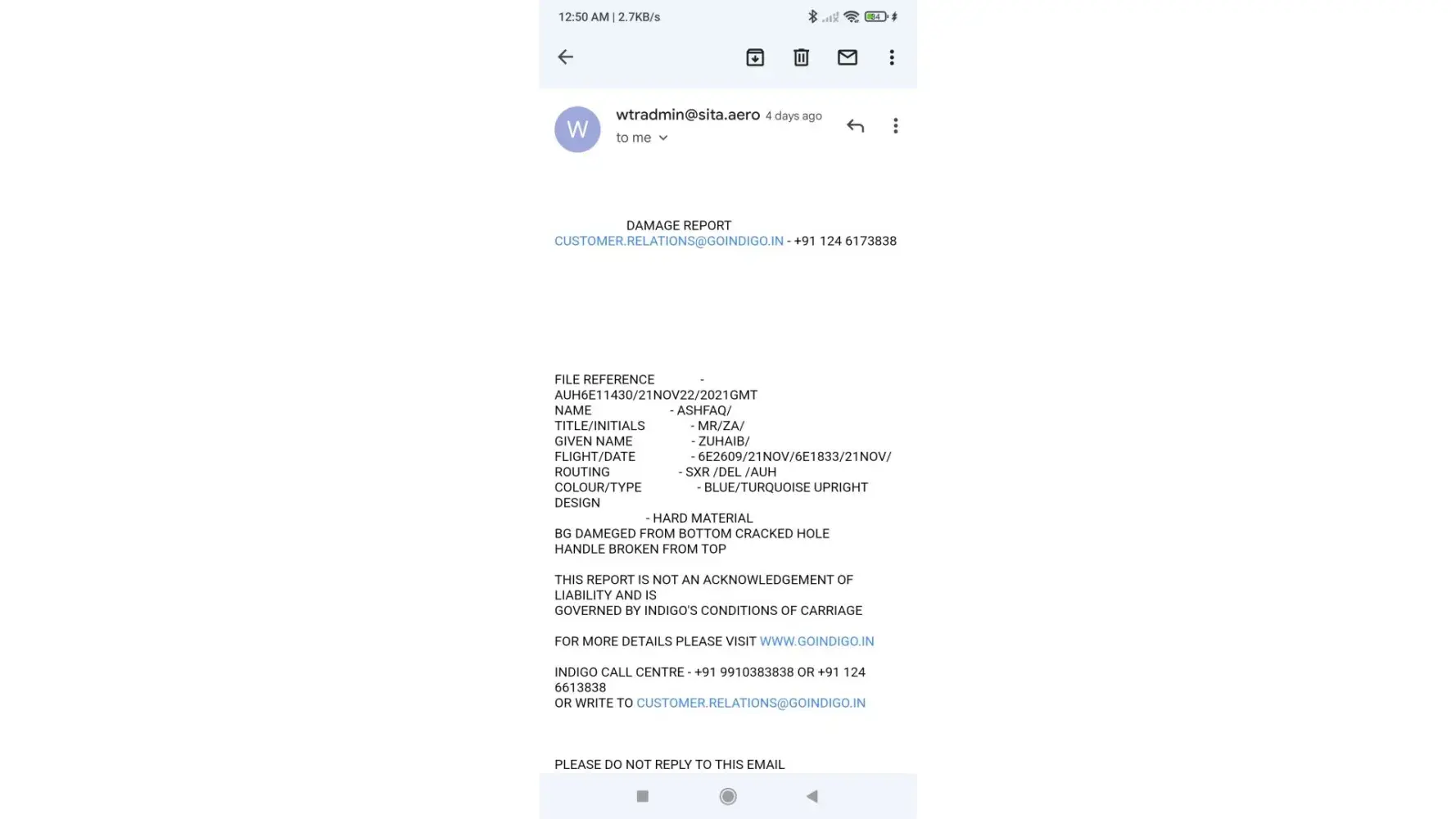 IndiGo Airlines Lost Luggage: Ticket ID: 5678847