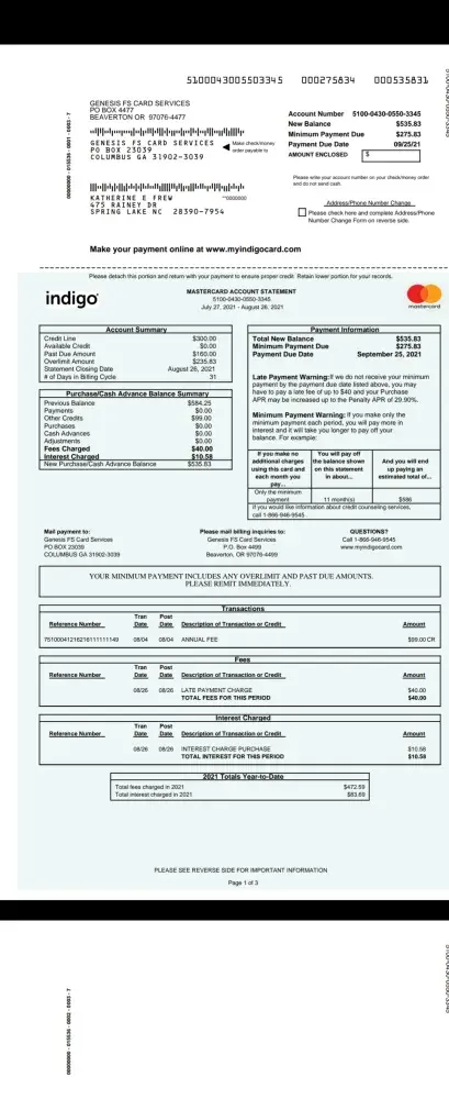I had an Indigo account. In 2020 I started receiving fraudulent charges from Google. I contacted Genesis FS card services regarding these fraudulent charges. My card was cancelled and a new card issued. While the charges were being investigated I was still forced to pay interest and payments for these charges and incurred late fees and overlimit fees as well. When the investigation was over Google had refunded all the charges but they were not all applied to my card balance and the payments I had made were not credited on my account for those charges . I went through this process 2 more times until I finally got tired of arguing with them because nobody I spoke to understands English and could not understand what I was trying to explain. They tried to say I had a balance of 600.00 to pay on the account. This is absolutely impossible because I had not even used the card for purchases. Going back from the time I opened the account if you removed all the charges from Google, the late fees and overdraft fees along with the interest for the Google charges, and then take all the payments I have made it would come out that they owed me money not me owing them 600 more dollars. After I threatened to contact the attorney general's office they then made it where I could not get any of my billing statements online and they said since the account is closed they do not keep those records anymore. I know this is illegal. They have broken their own terms and agreement in how fraudulent charges are handled. Google has refunded all the money for the charges but that was never applied to my account when Indigo was making me pay for them while they investigated. Now they refuse to even give me the 80.00 credit where I overpaid the balance.