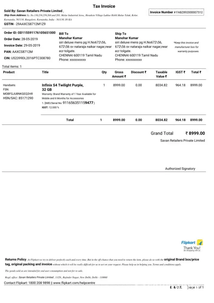 I am RESHMA J S. I am a student. My brother recently purchased a phone for me. He bought INFINIX NOTE 12 phone from FLIPKART on 15/11/2022.
