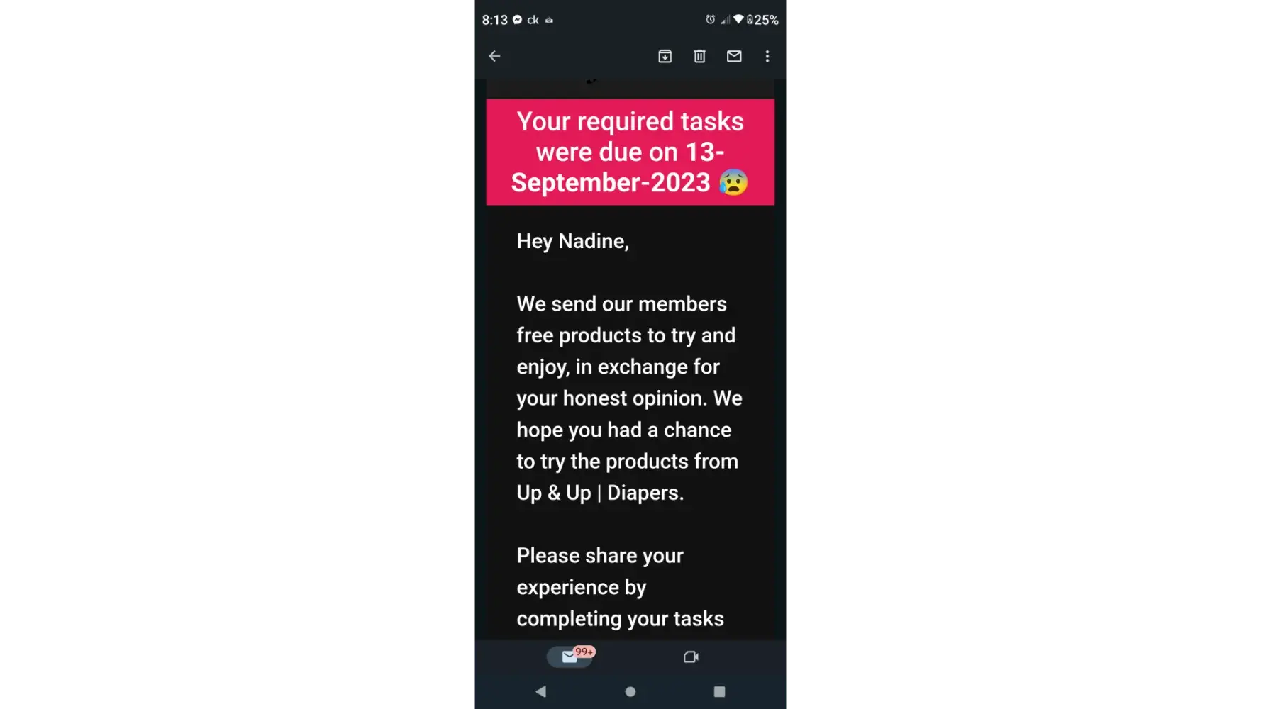 Back in August or September I got approved for the diapers the pull-ups are in the diapers and I didn't get them until like a couple weeks ago Well by the time I received them the campaign or whatever was already over so I had no way to post it on the app so because of that I've gotten denied like three or four times now for surveys because I haven't finished my opinion on the diapers and I'm really irritated because I've emailed probably four or five times now telling them that this was the issue and I have not one time gotten a response not even from an automated thing stating that they received my email and now I'm being held responsible for their mistake and it's not fair because I really enjoyed this app but I'm really starting not like it no more because of this reason!
