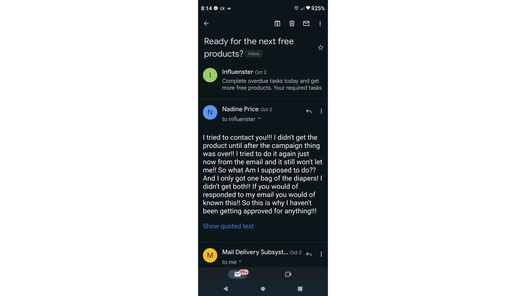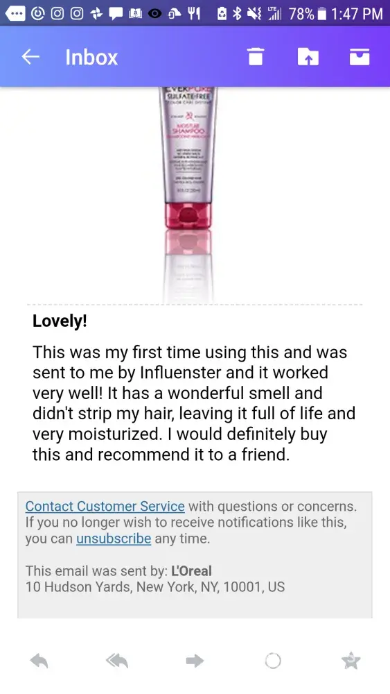 I searched through all my email accounts, but I couldn't find any record of ever having received anything from Influenster. And I know for a fact that I've never deleted an email from my inbox on any of the first two accounts.