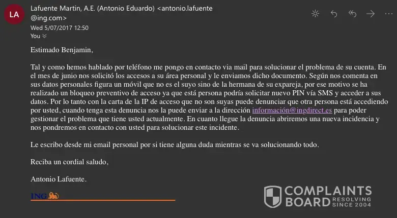 As an ex good customer of ING Espana, with a good track record, I feel that I have been served a great injustice and the person who committed the fraud has gotten away with my money and no repercussions. I will take this further until justice is done.