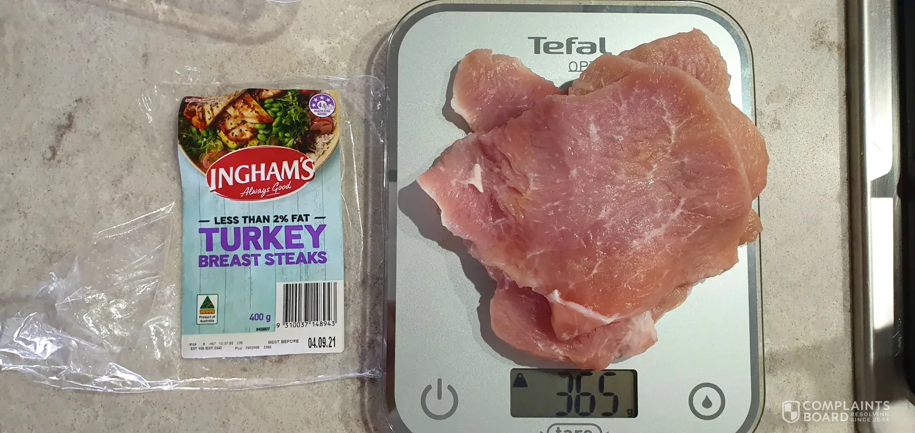 The Ingham Company Australia sells 400g of turkey meat, but in reality, they are only 365g of meat.