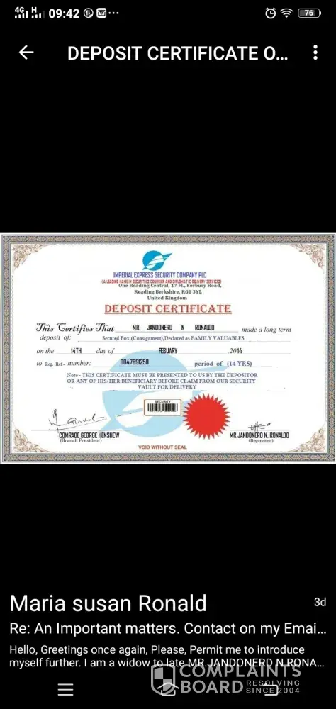 Read full complaint and 4 commentsMaria Susan Ronald - to claim an inherited funds & gold