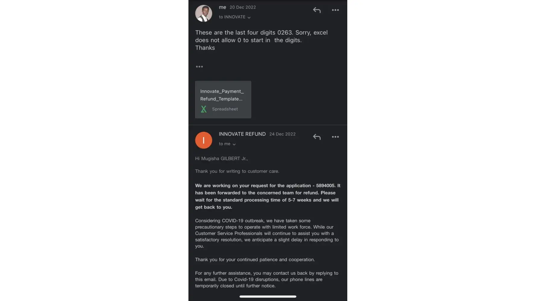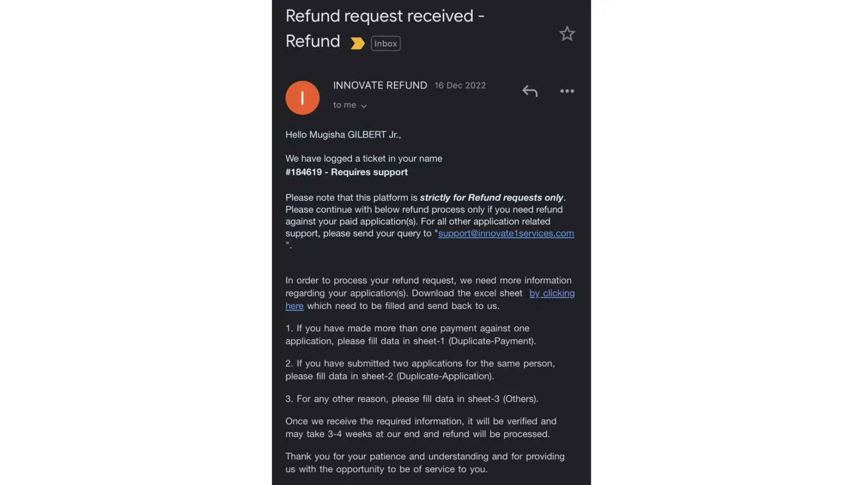Please I paid for a Visa twice , that was Entry Visa from Uganda to Nigeria(Paid $112 on 7th December 2022,App ID 5894005, Reference number [protected]) which could not be processed due to technical issues at the Nigerian embassy as i was told. I was therefore advised to apply and pay for Visa on arrival (which i did on 20th December 2022, Application ID 431309, Reference Number [protected], Amount $112) and then ask for a refund of the earlier payment made on 7th. I have followed up after the end of 5-7 weeks refund period but in vain,refund ticket 184619.
