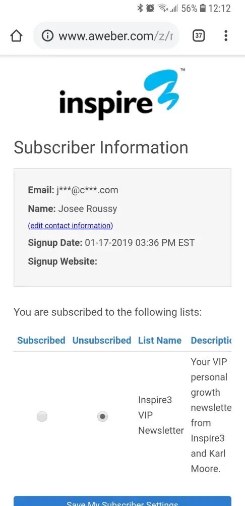 I keep receiving emails from Karl Moore/Inspire3 despite having on numerous occasions unsubscribed. Whenever I succeed to unsubscribe (been going on since Dec 16), it is always temporary. I started receiving emails again last month with the pretense that I had signed up and needed to confirm. I did not sign up. I did in 2016 and been regretting ever since. Below is a screenshot of when I unsubscribed on Jan 19, with the pretense that I signed up on Jan 17, which is false. I just had to unsubscribe again a month later after I was going through my spam folder and realized I was still getting emails.