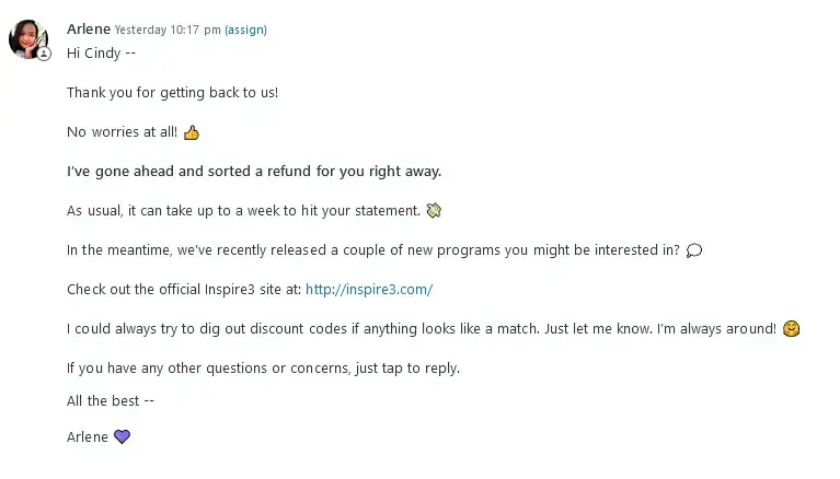 My experience with InSpire3 is that they have responded within a few days to my emails relating to software questions or unsubscribe from their email list. Because of their quick responses in these incidences I am certain that they are not willing to honor their money back guarantee.