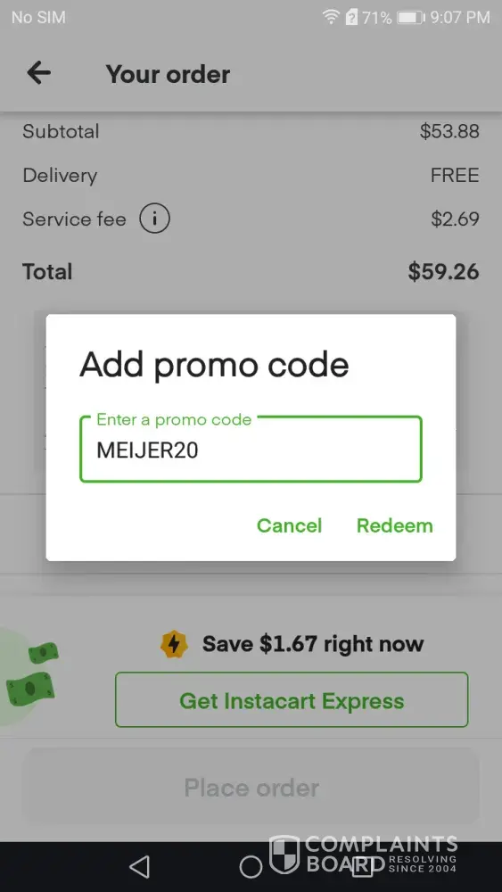 Would not honor $20.00 off offer for next 3 orders in Instacart email or a $15.00 offer off next 3 orders. Reason given was that I already had used a credit. Credit was $2.80 that I was overcharged on a previous order and I could not use more than one credit per order. What a bunch of BS. I'll go to the store from no on, nothing but a bait and switch from a lying cheating company.
