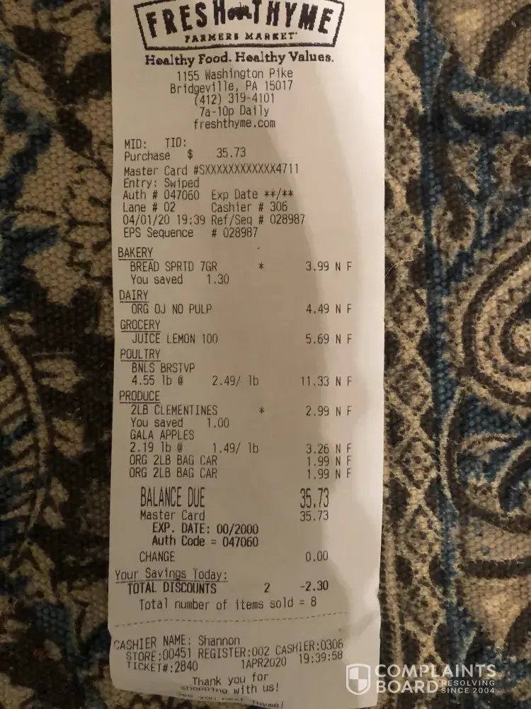 I ordered from Fresh Thyme using Instacart service and based on initial shopping list of items, the charge was $65, so Instacart temporarily charged my credit card for that amount. When the shopping was done on Apr 1st, many items were not available which is fine.