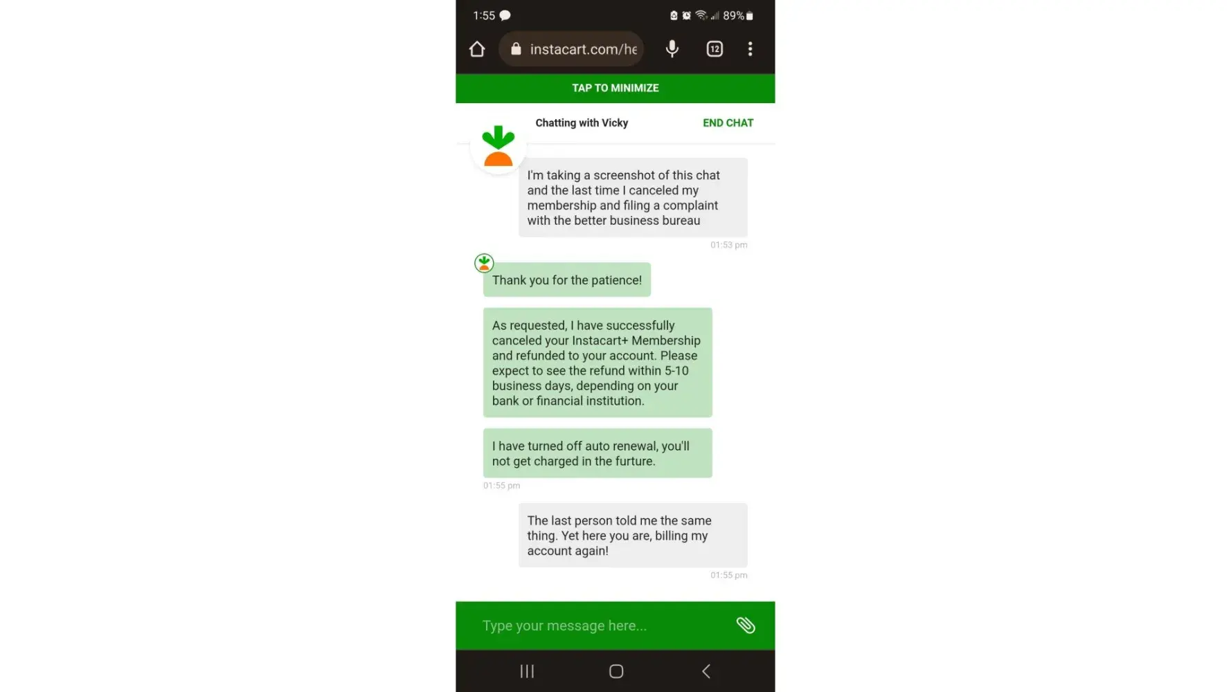 Today, I was billed by Instacart yet again. I had to contact them for the third time to cancel my account. I have screenshots of this conversation as well.