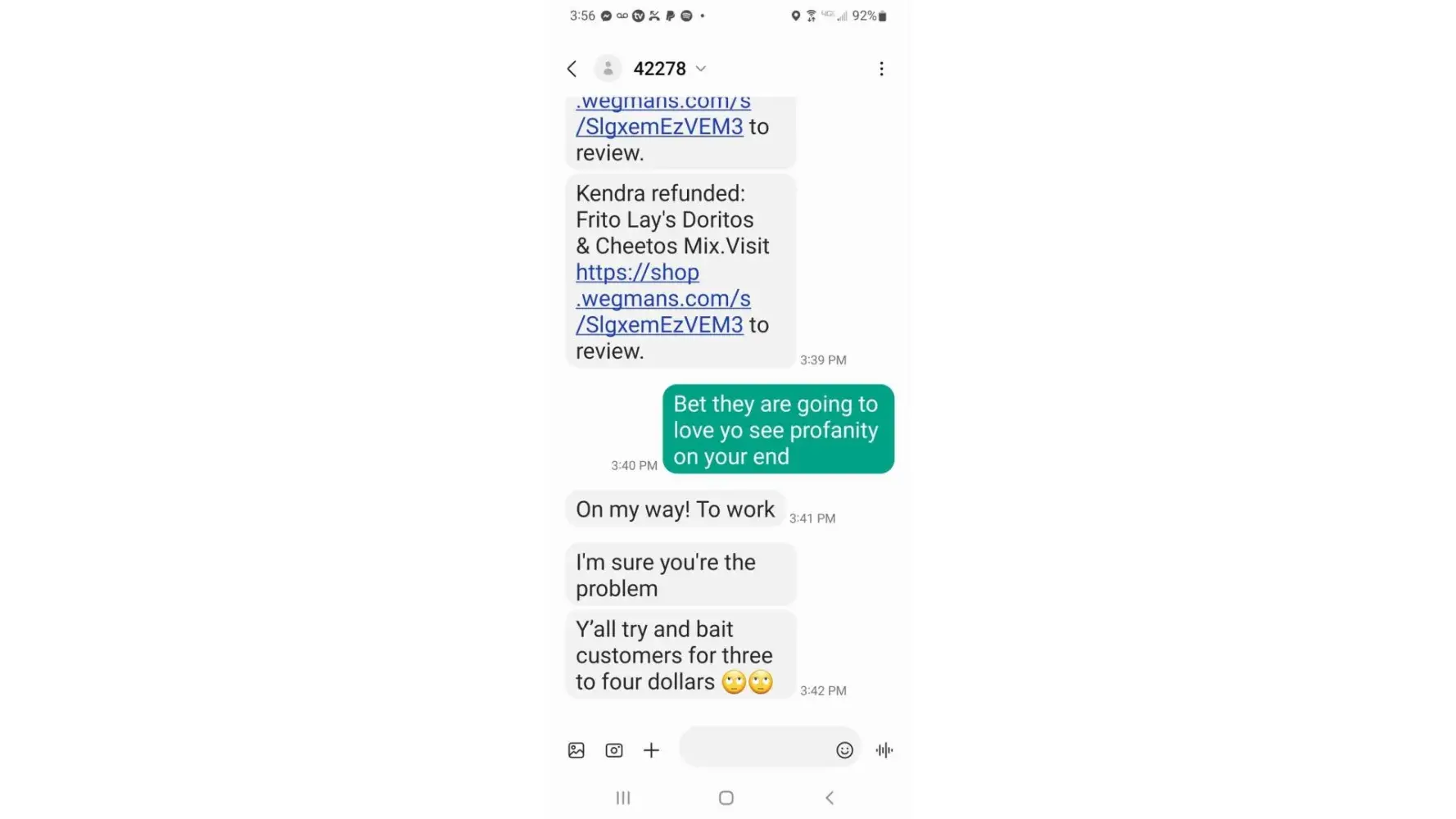 what follows is a word for word verbatum message between me an Shopper Kendra: