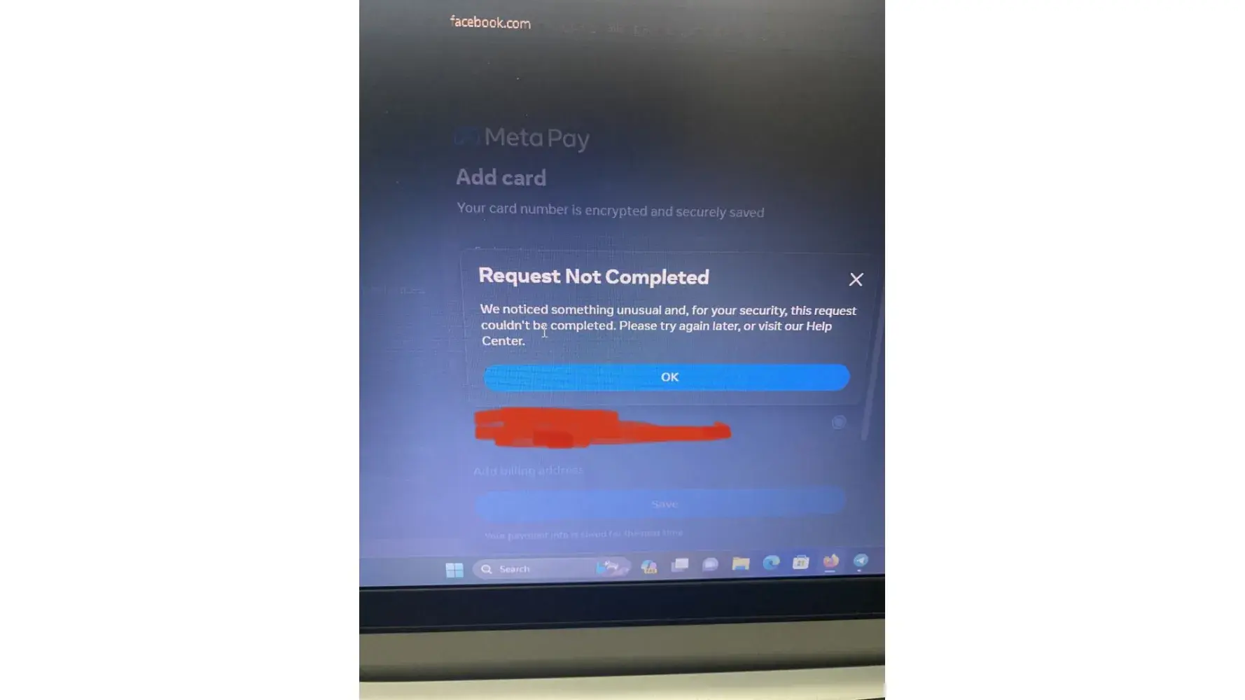 Every time I enter my debit card or credit card details in Meta/Facebook Pay, a message pop out saying. "Request Not Completed. We noticed something unusual and, for your security, this request couldn't be completed. Please try again later, or visit our Help Center."