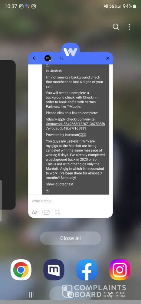 Hi all, my name is Eric Washington. I’m an alumni of Marquette University and currently live in the state of Illinois. I found Instawork as a means to supplement income to eventually become primary income in hopes of this helping me to deal with and gain cash due to a current ongoing court case I have which makes it difficult to get quality jobs that I seek. When I found Instawork, I found it to be a safe haven. I passed the initial background check and began work. My first job was with an warehouse company to which I successfully completed with no hiccups and was approved by my supervisor for the hours I completed. A couple days later, I applied for another job thinking this too be an reliable income. I was incredibly wrong. After I was ready to work for my second job, Instawork runs THE SAME BACKGROUND CHECK ON ME THAT I PASSED THE FIRST TIME, and then tells me I am facing pre adverse actions due to my court case which will be over in February 2023. I told them that’s fine and even explained PERSONAL DETAILS to the case to which they recommended rehab treatment as a means to getting the court case removed off my record or possibly probation. Understanding that, they completely ignored me. Is it legal for them to take your wages away for what you worked? I caused no trouble whatsoever to which I have evidence from the employeer to back me since it was completed. What I thought Instawork was, came to the realization it wasn’t. Please, if you have any pending court cases, DO NOT WORK FOR Instawork. Even if you do, to me, they are not a moral system to work for in the first place. It’s like they use you and then get rid of you when they don’t get what they want.