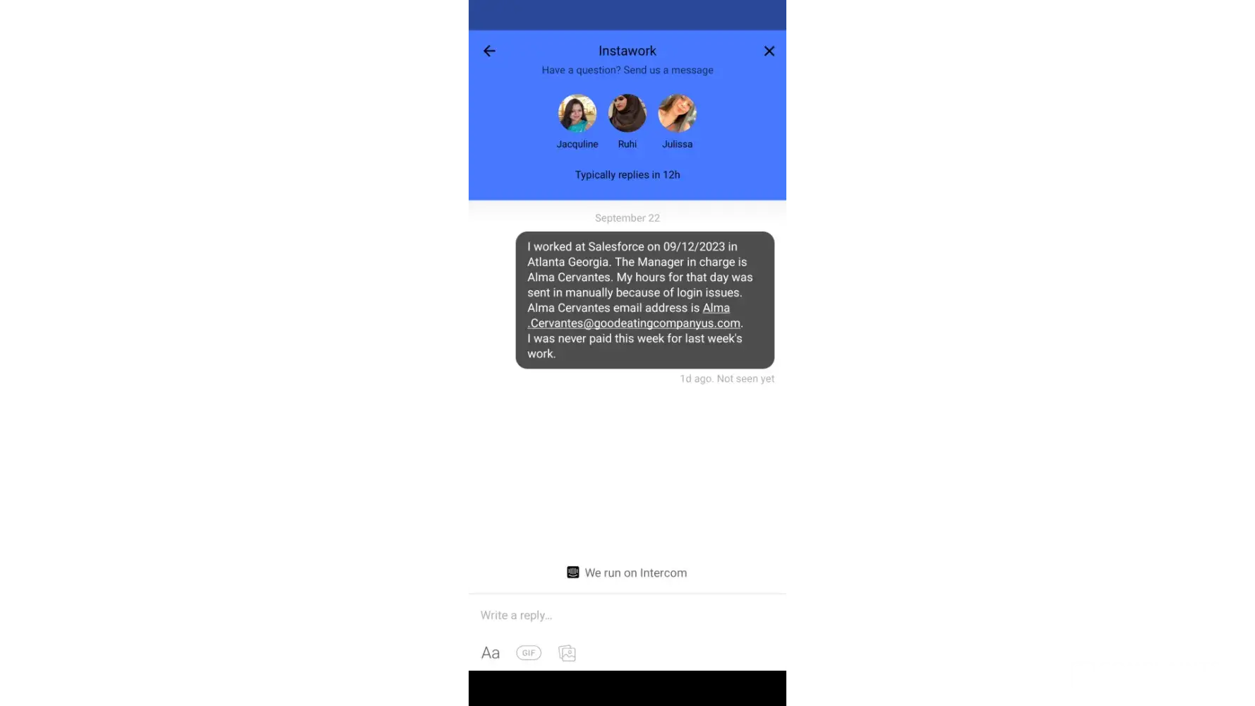 Worked at Salesforce in Atlanta Georgia on 09/13/2023. Was hired through Sodexo by Alma Cervantes... received a job offer from Alma through Sodexo, but at the last Minute Alma Cervantes mentioned that " They're using Instawork for a " Trial Period " while my background check was processing. Alma Cervantes allegedly" sent my Time in manually to Instawork " because my phone was down. First Alma Cervantes told me instawork don't have a phone number & she could only " email them". Then she mentioned all of the sudden that instawork " have a phone number" but refuses to give me the number to a person from instawork named " Daryl". I sent countless emails to instawork about my money...I verified everything that they needed & yet they refuse to pay me.