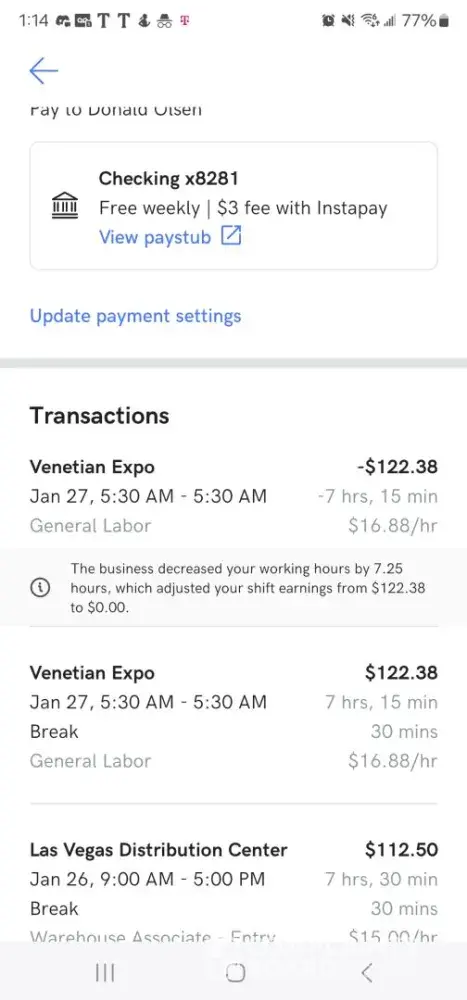 So I work shift for Cort at venetian in Las Vegas nevada on Saturday 1/27/2024. After completing my shift day after it showed in my earnings 7 hour and 15 minutes. 530am to 115pm. After a couple I checked my earnings again and had seen that my hour were adjusted to 0 hour work so I end up not getting paid for that shift. I had contacted instawork and it has been 3 days now and still hasn't been fixed. I am extremely frustrated and mad about this. Really don't like fact that they can get free work out someone like that. I have prof of my location and timeliness of that day.