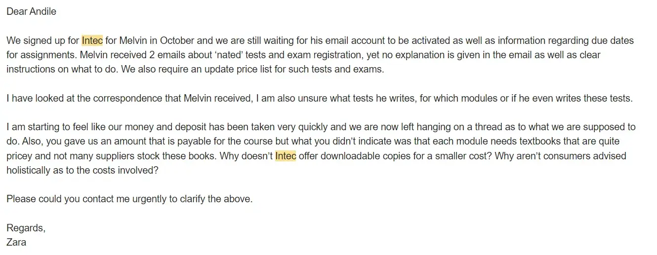 Dear Intec college please take not that I have still not received my diploma i only received my progress report I've placed the school in full funds. I have completed a INTEC AWARD REQUEST FORM and forwarded it to the following email adress: [protected]@intec.edu.za together with my certified copy of ID and my progress report this was sent on the 3 Marh 2023, I sent it again on the 27 March 2023. I sent a follow up email again on the 6 June 2023. Why is it such a hustle to get my diploma I want to further my studies and apply for other employment but intec is holding me back. This is frustrating and unacceptable.