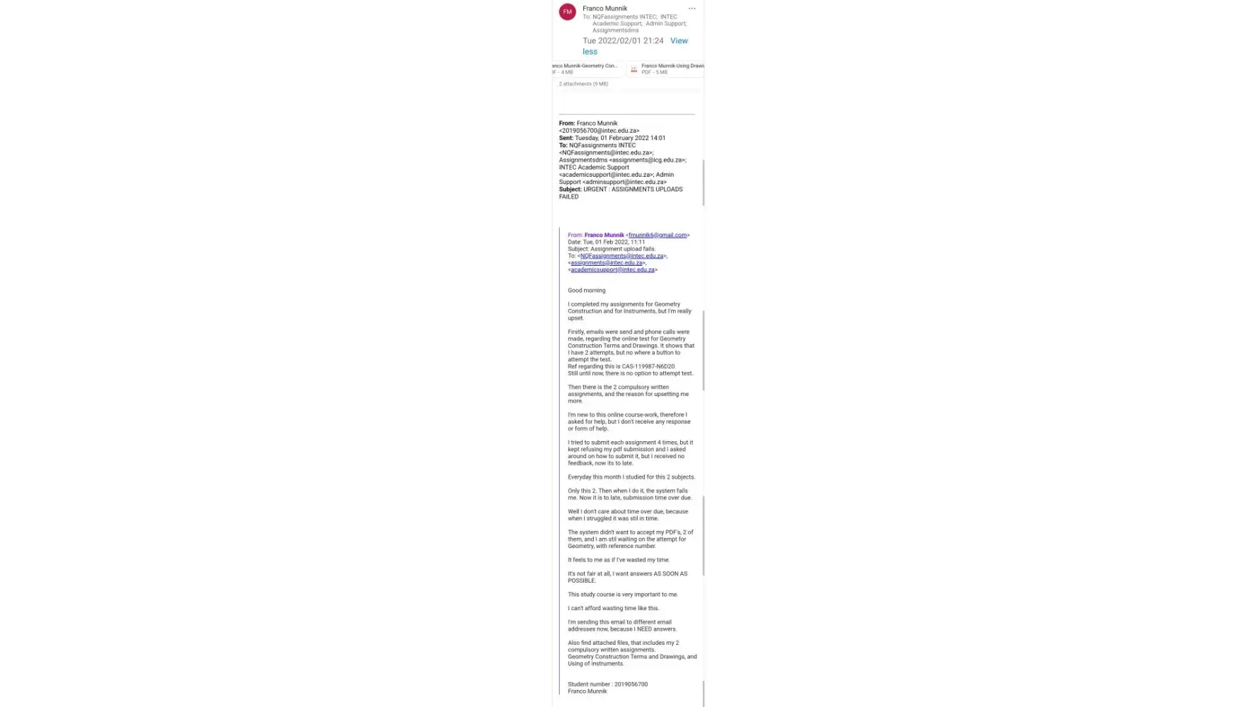 How many more times ahould I send my student numbers to useless email addresses? In my complaint they are both listed.
