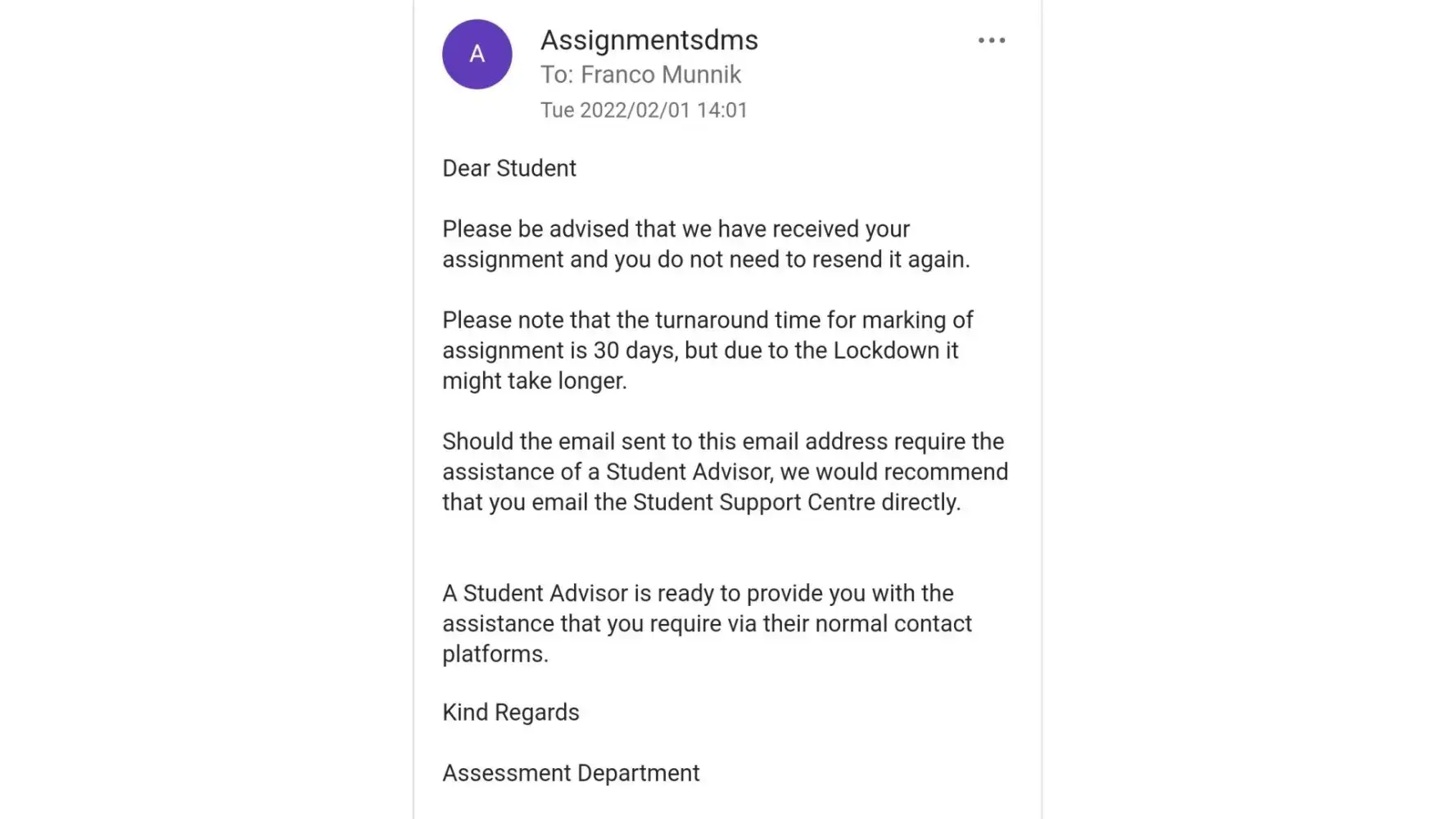 I have only recieved one marked assignment back in 2021 6 months after I wrote the exam. I have not recieved any other assignments back nor confirmation that they were recieved on the email address provided to me.