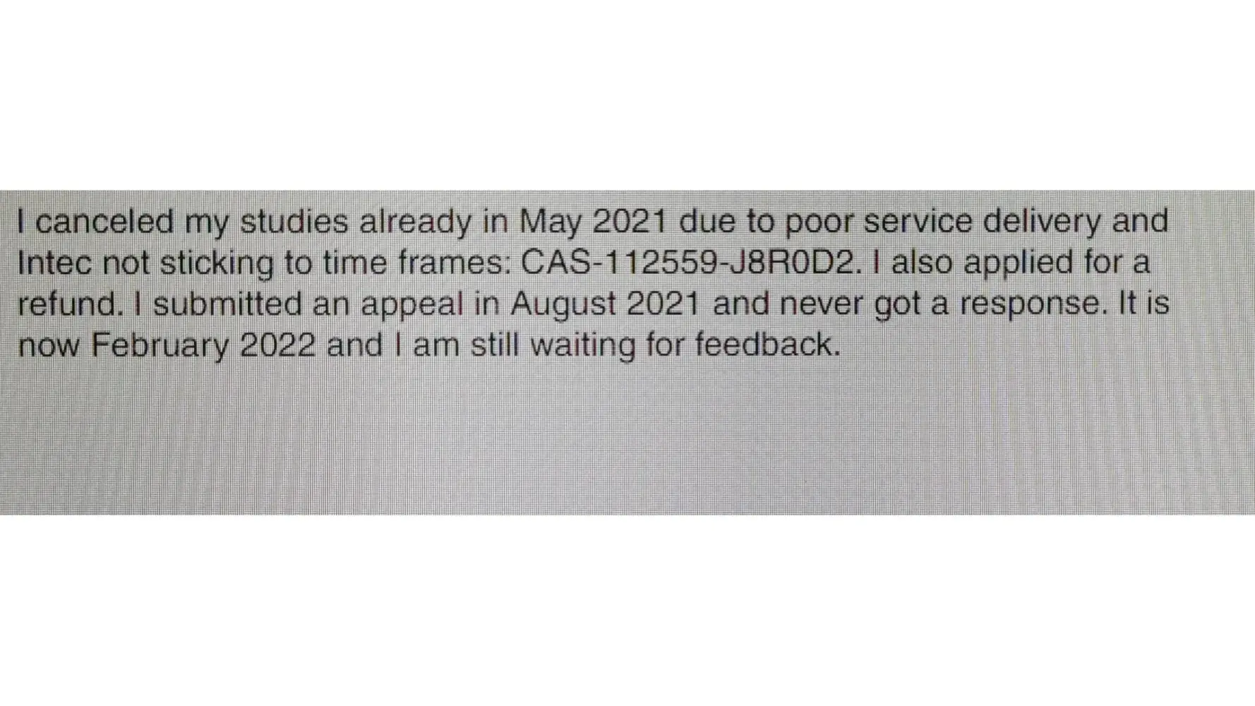 I canceled my studies already in May 2021 due to poor service delivery and Intec not sticking to time frames: CAS-112559-J8R0D2. I also applied for a refund. I submitted an appeal in August 2021 and never got a response. It is now February 2022 and I am still waiting for feedback.