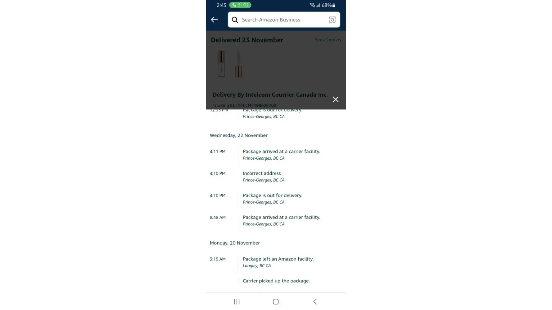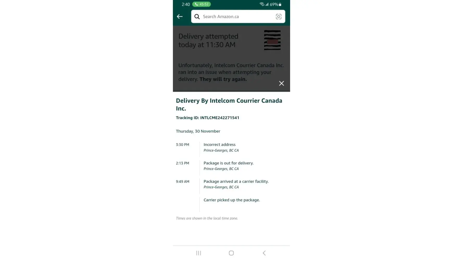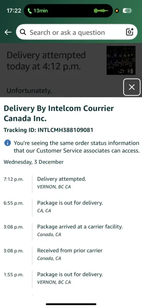When I ordered my Amazon order it was expected to be delivered to Kamloops on November 21 and on the 22 it said it was delayed due to severe weather. Looking at the Intelcom tracking the package arrived in Kamloops on November 21 at 5 am and I can confirm the weather is beautiful in Kamloops on the 21st and 22nd, no snow or rain, just sunshine. What is going on?