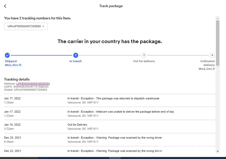 I have four pages in a row that was supposed to be delivered by Intelcom Courrier Canada Inc. and didn't get any of my packages. I tried contacting the company and it said 24-48 hours reply and it's been 6 days and nothing. 4 days ago they said they attempted delivery which was false and they returned one of my packages to their facility. You would think it would go out the next day but that's not happening. I'm hoping to never have to deal with them again and I hope Amazon stops using them. I've talked to many others in my area and they are experiencing the same issues.