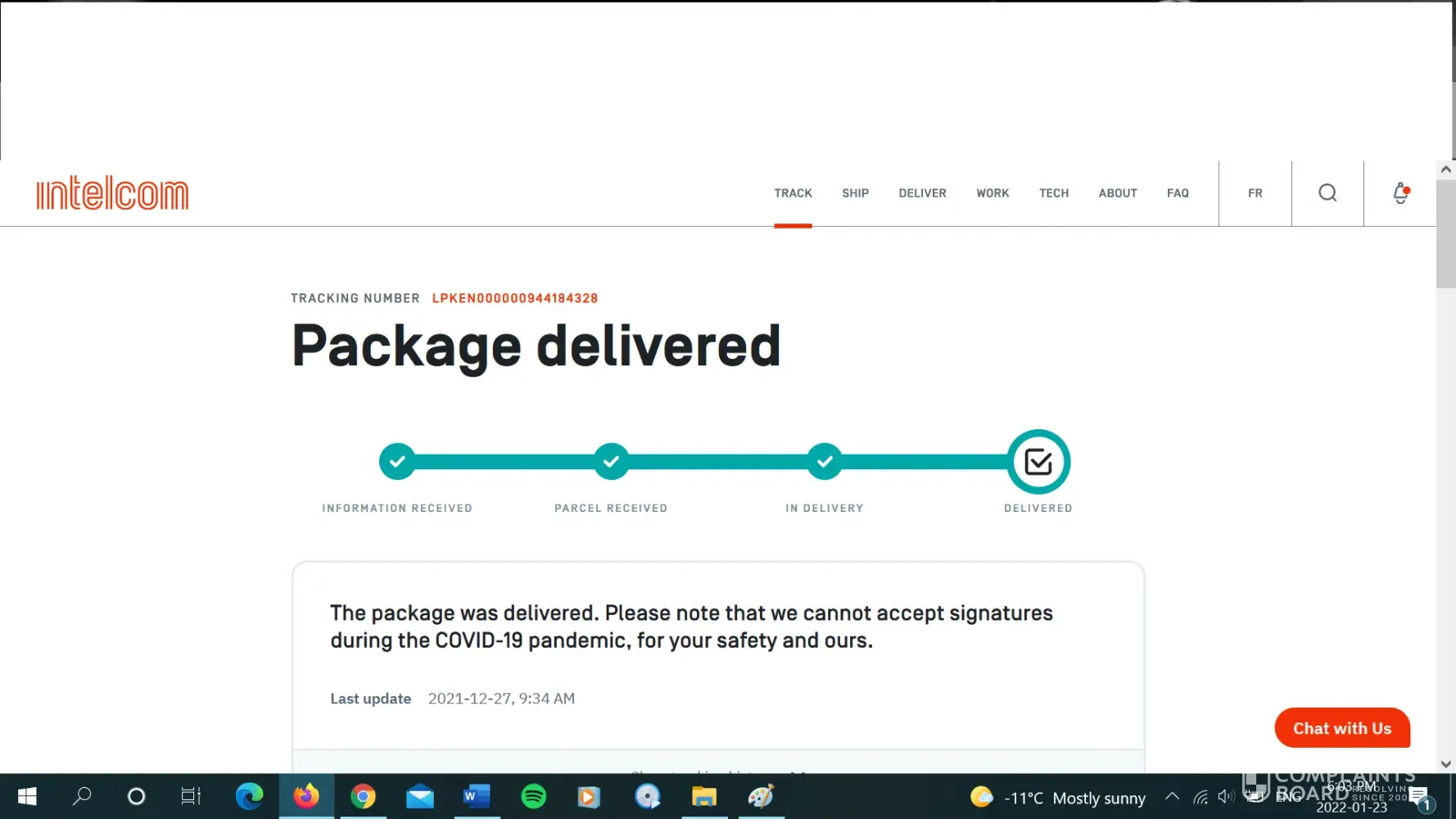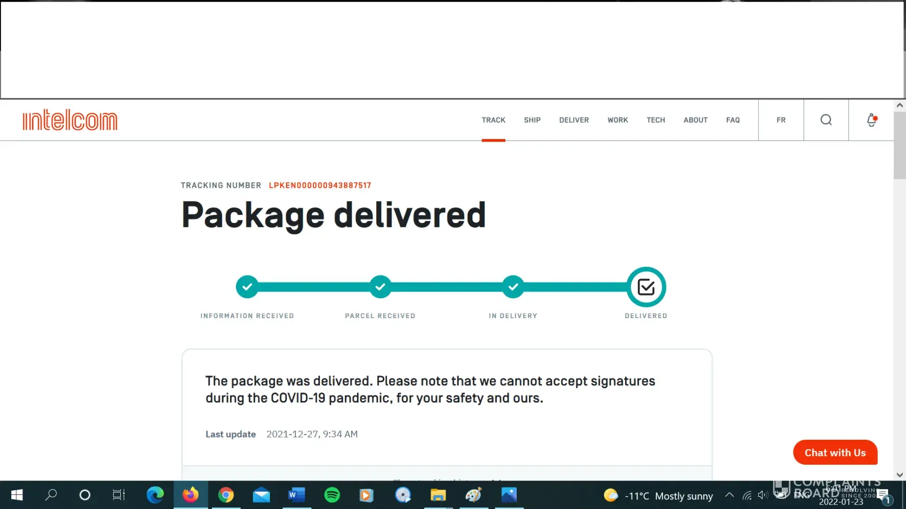 We continue to have recurring issues with Intelcom, namely the failure to notify us of an actual delivery, loss of packages, delays etc…. So far, the situation remains the same with no action from Amazon and / or Intelcom. The packages are simply left without notifications and many have been stolen as a result. This is totally careless and unacceptable!