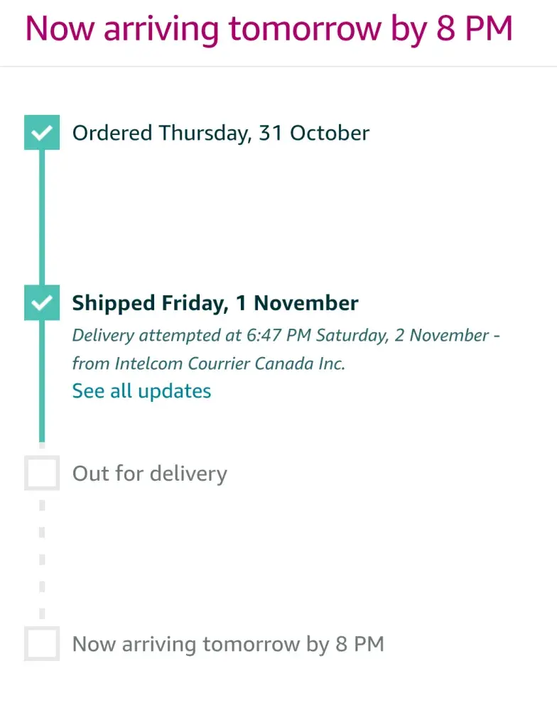 Oct 29th 2019 I made an order as usual on Amazon . CA It's nice that they attempt to deliver on Nov 2nd after failed attempts but they always seem to get my address wrong and when I email them, they write me back in French language so I don't understand what's said