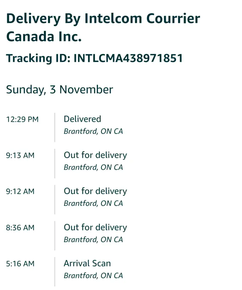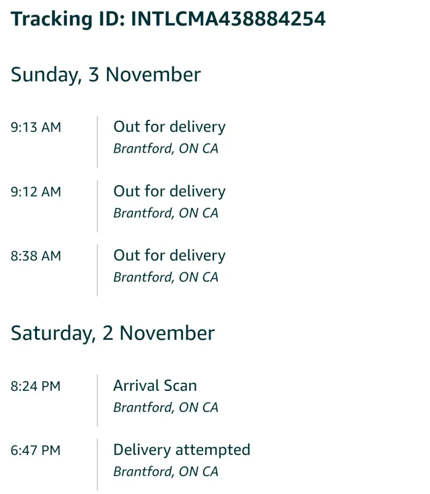 Fast forward to today Nov 3rd parcels are out on delivery again but in Brantford. How can this company always get Hamilton mixed up with Brantford and many times they get lost in Hamilton having to call and ask where exactly I live on the map. I'm in downtown Hamilton. Very common address with postal code or they're not getting correct address information from Amazon.