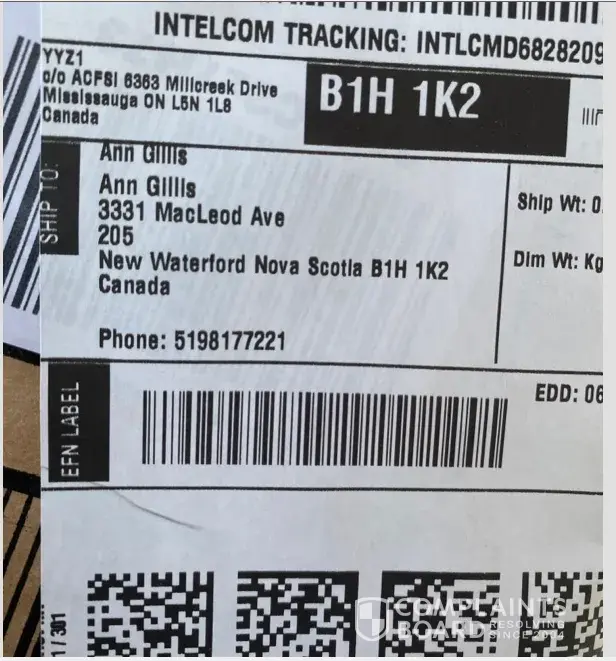Was following package [Amazon.ca] with Order# [protected] and Intelcom tracking number : CMD931576032