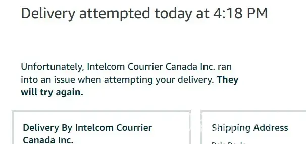 I received a notification from Amazon that Intelcom tried to deliver my package and they will try again. As usual my delivery instructions were ignored, I received no phone call as directed as my building is locked. This is upsetting and really makes me less likely to order again for fear of not receiving good service because the drivers are in such a hurry they can’t take a moment to check instructions or place a call. Now I wait as my package will be most likely not delivered on next attempt.