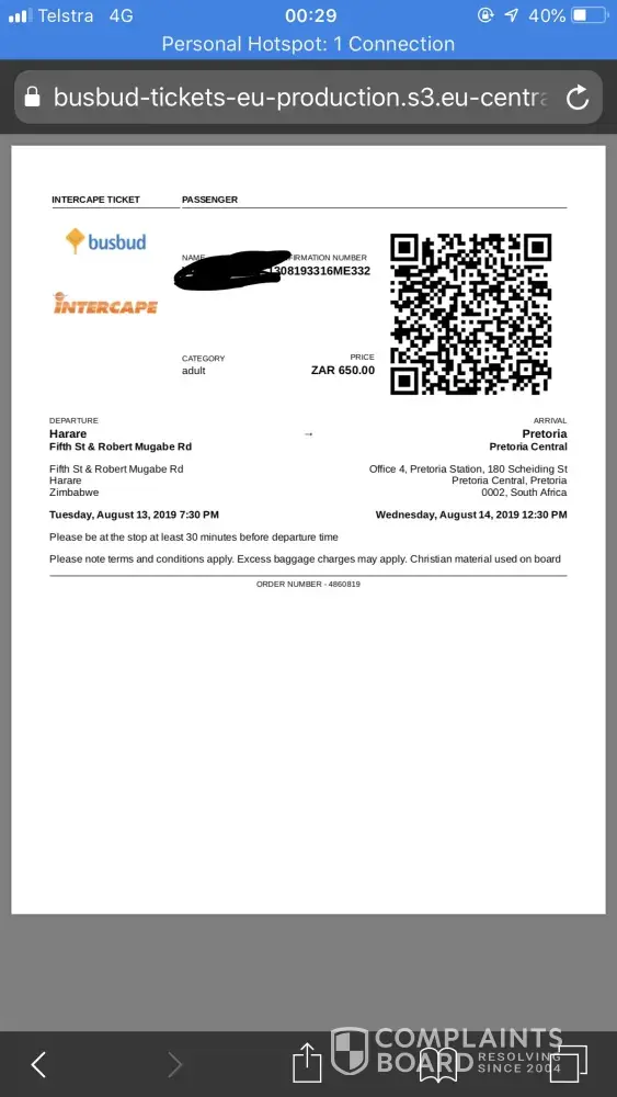 I have always been a loyal local South African intercape rider and so when I saw intercape route while I was on my holiday in Harare I decided to take a bus to Cape Town instead instead of flying and experience a descent road trip. But to my dismay I had the worst experience ever. I took the Harare to Capetown bus (905) that departed on 7 August at 1800hrs and was meant to arrive on the 9th of August at 8.30 am but arrived at 1210pm instead.