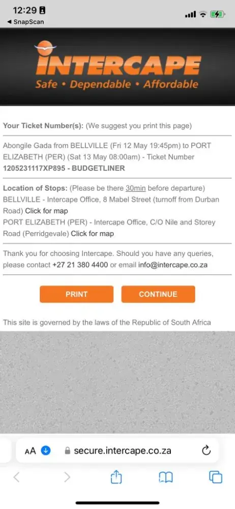 Be aware when you pay for a Intercape bus trip online with your credit card in South Africa. The money is deducted from your bank account, however you will be unable to get on board the bus if you do not have your credit card with you.