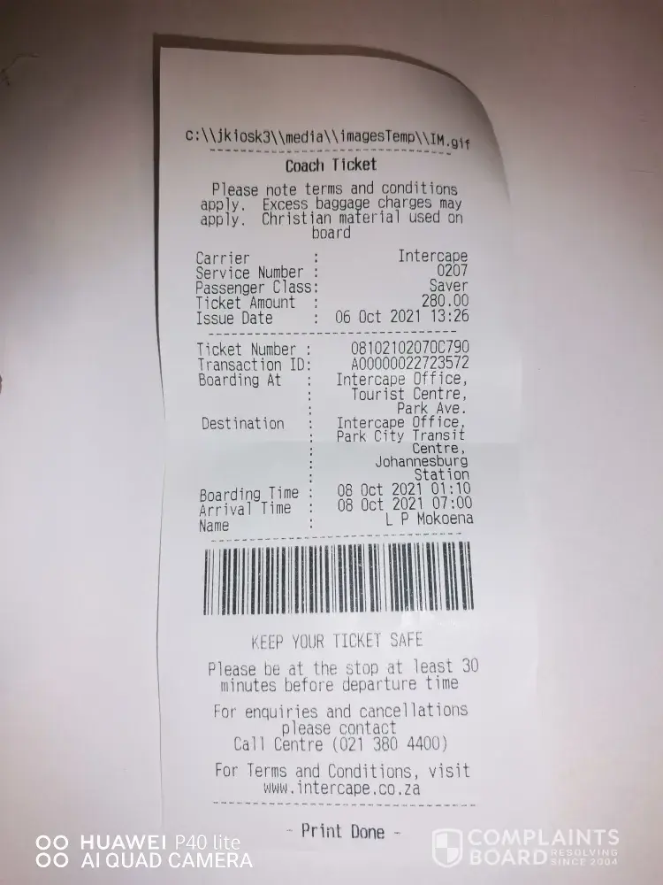 Hello, i bought a ticket on 6th Oct from Bloemfontein to Johannesburg from Spar in Baysvalley complex. The date on the ticket was suppose to be 9th October but instead it was 8th October, so when I got to intercape offices thats were i was told my ticket is wrong and I'll have to buy another ticket, they tried to get me a but everything was fullðŸ™. And the saddest thing was that i couldn't get a refund and i was stranded not knowing what to do, then i had to popout more money from my pocket to purchase another ticket then wait hours for the next bus it was cold. How do i resolve this because it was not my fault?