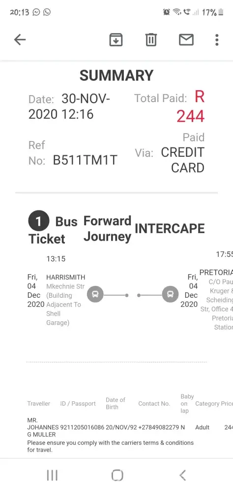 The service offered by Intercape is absolutely appalling! They take the passenger's contact details as well as the contact details of the person who booked/paid for the ticket.