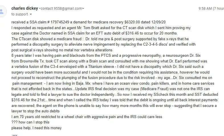 Please acknowledge when the auto debit against my ss checks will stop first payment was on 12/09/20 payment type an eft for $316.46 claim # [protected] a payee name charles r dickey the us department of the treasury reported the applied debits to be ongoing thru 7/22 my ss check for 8/22 shows an etf debit for $316.46 please respond as to when this debit is going to stop my phone calls to them is no help; keep being hung up on I need this money to pay for needed health care items that I have had to do without