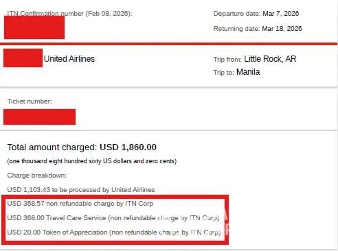 US$158.90 Ticket Protection (non refundable charge by ITN Corporation)