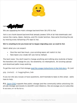 So this morning (at 9:02 AM (PST)) when I was eating my breakfast, I got a email that my account (Hugging Face) was upgraded to Xet. Now I don't use this website that often but for no reason, they just upgraded it to Xet. Note that I didn't do anything to trigger that email. I provided a picture on what it looks like (one of the parts is covered because...