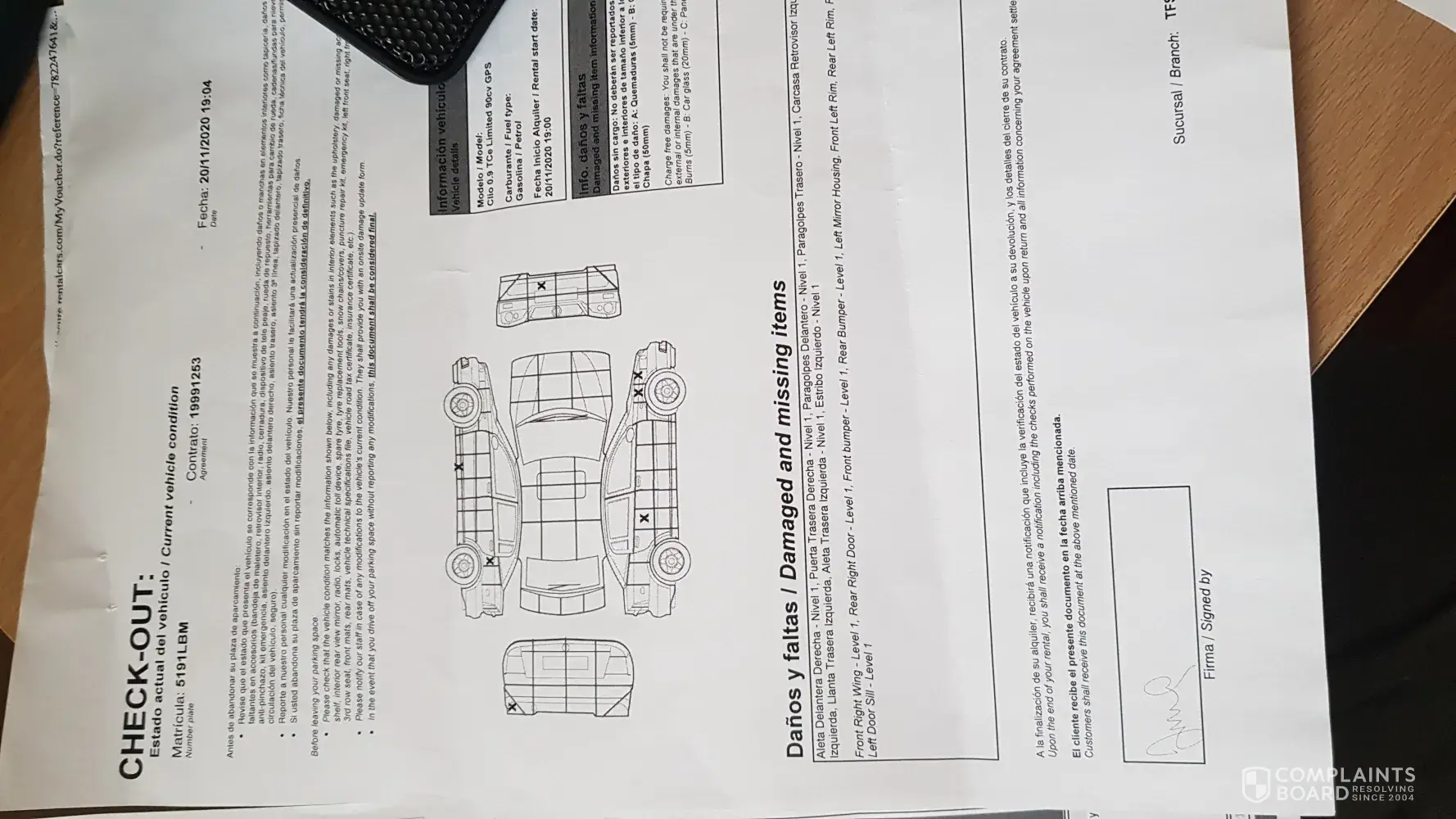 My wife sent an email to contest this damage and forwarded our initial collection photos before we boarded our flight as the manager would not be in the site office until the afternoon on Monday 2nd December 2019.
