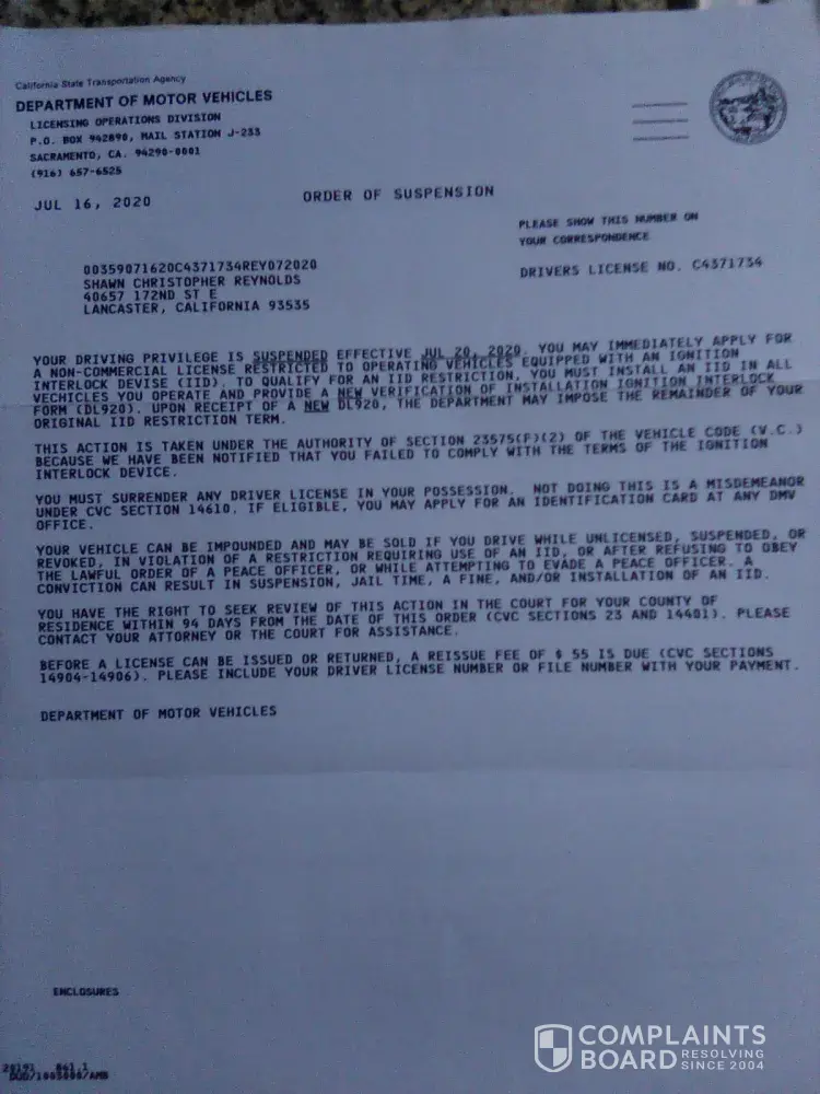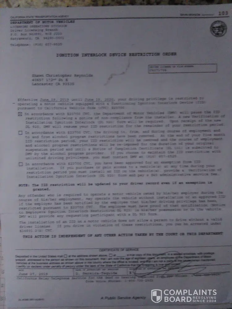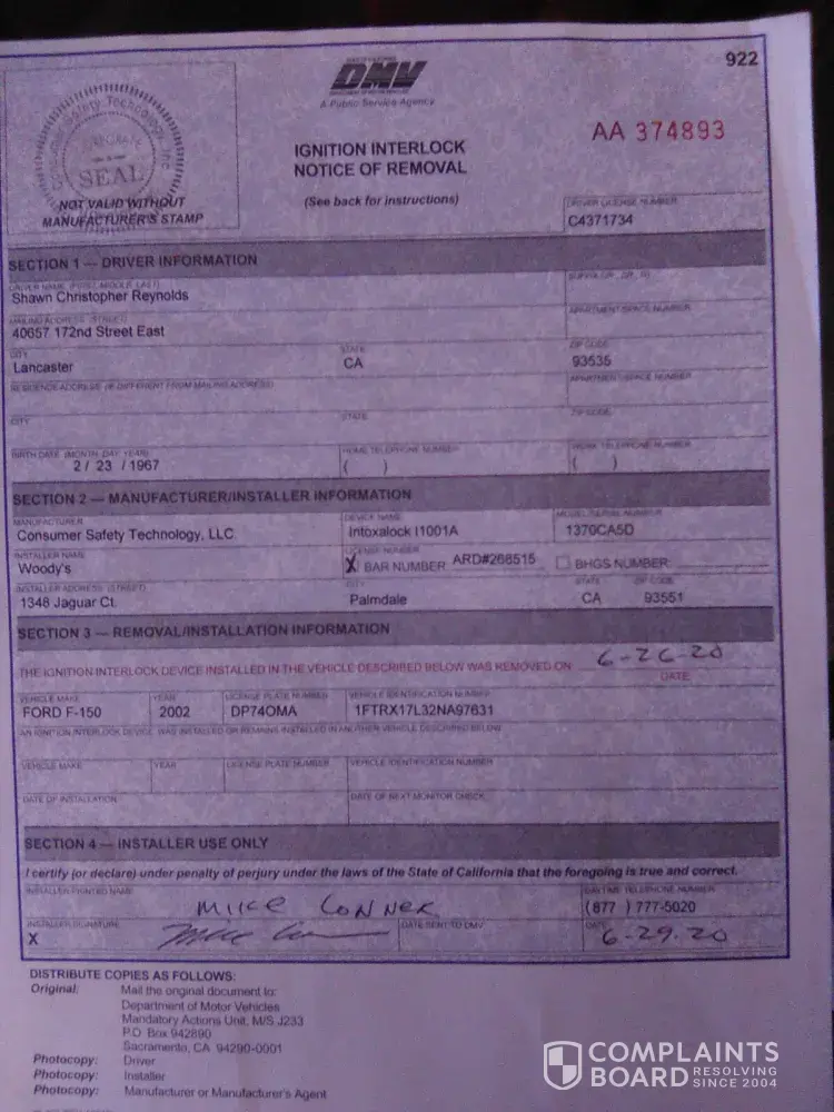 On 05/15/2019 Intoxalock and I entered a lease with a customer ID#829472 being assigned to my account. I willingly entered this agreement predominantly because of their advertised assurance of assisting clients through the state of California DMV compliance requirements. These assigned agents possessing varied titles including "State Compliance Specialist" and State Experts" and "Compliance Coordinator" and Compliance Manager" and State Experts" within Intoxalock. On 06/21/2020 I fulfilled the California State DMV mandated 1 year IID requirement. I personally contacted the MAU and was verbally informed that the 1 year mandate was indeed completed as of 06/21/2020. At this point I then contacted Intoxalock and requested the assistance in assuring the compliance of and then the removal of the leased device. Within an hour of the request, I was called back with the good news that we could continue with the removal process. I had confidently assumed that Intoxalock had contacted the Monitoring Authority DMV because they assured me that we would now schedule the device removal. Removal occurred on 06/26/2020. On 06/29/2020 I obtained the Ignition Interlock Notice Of Removal (dl-922) and immediately attempted to submit it at my local DMV in person. At this time I was informed that my restricted license would be suspended because of an unauthorized removal of the IID and that I could not retain a restricted license unless I first reinstalled an IID and the DMV obtain a new Verification Of Installation Ignition interlock Form (DL 920).