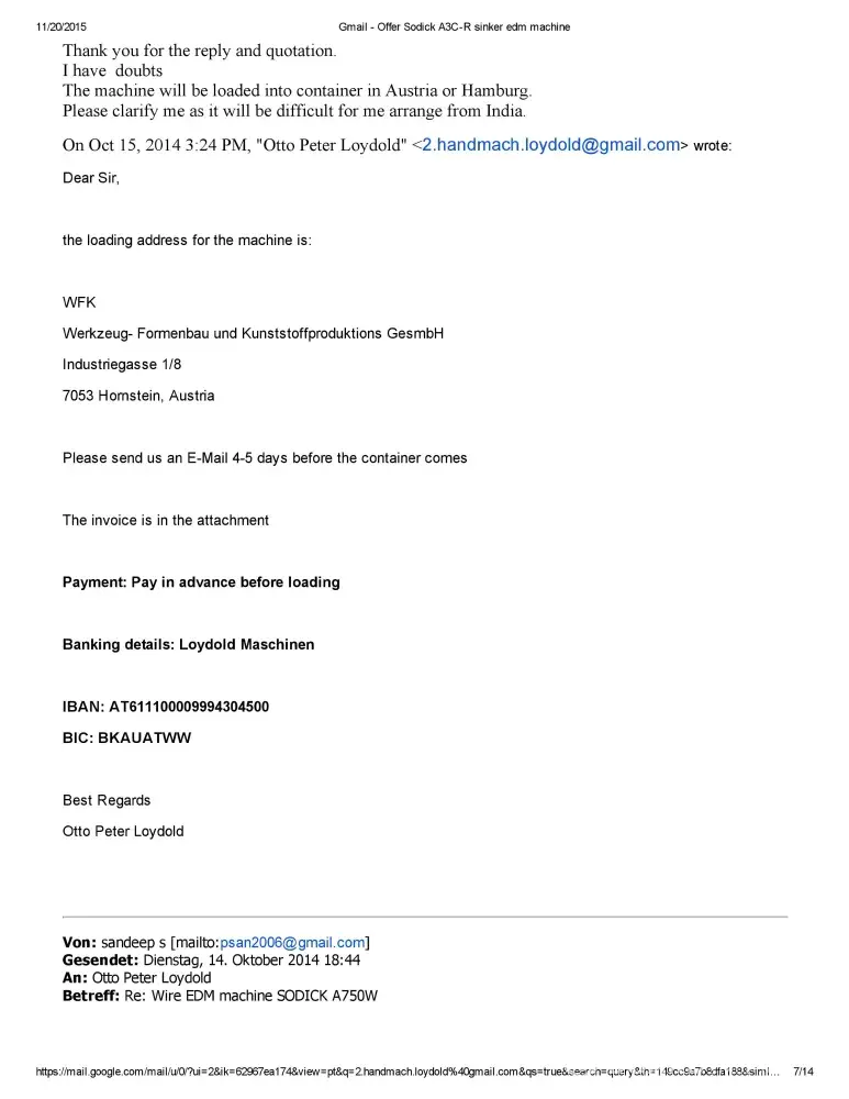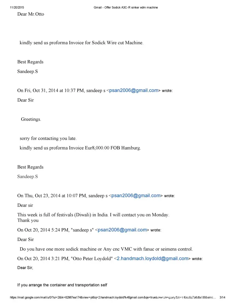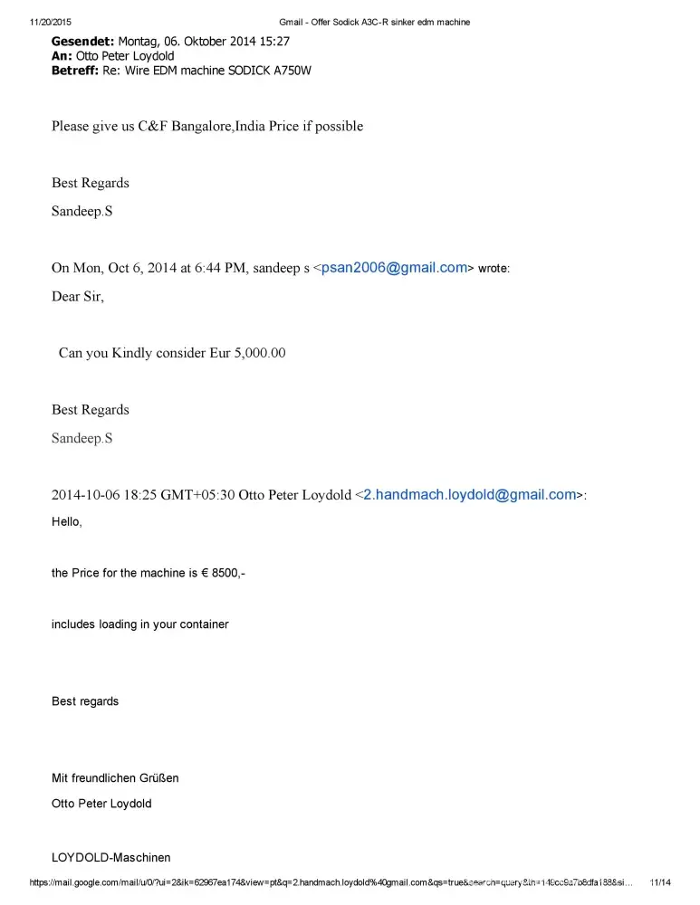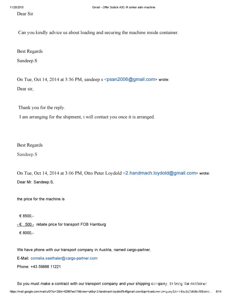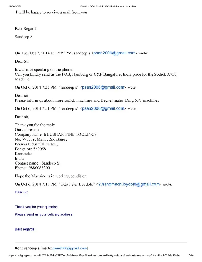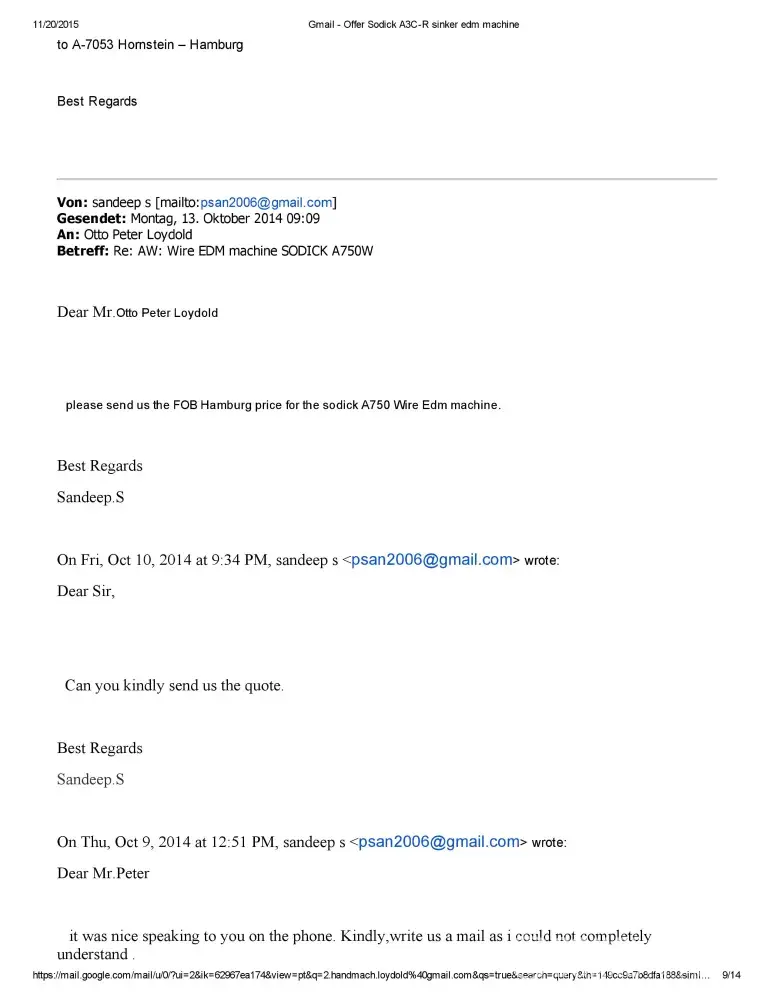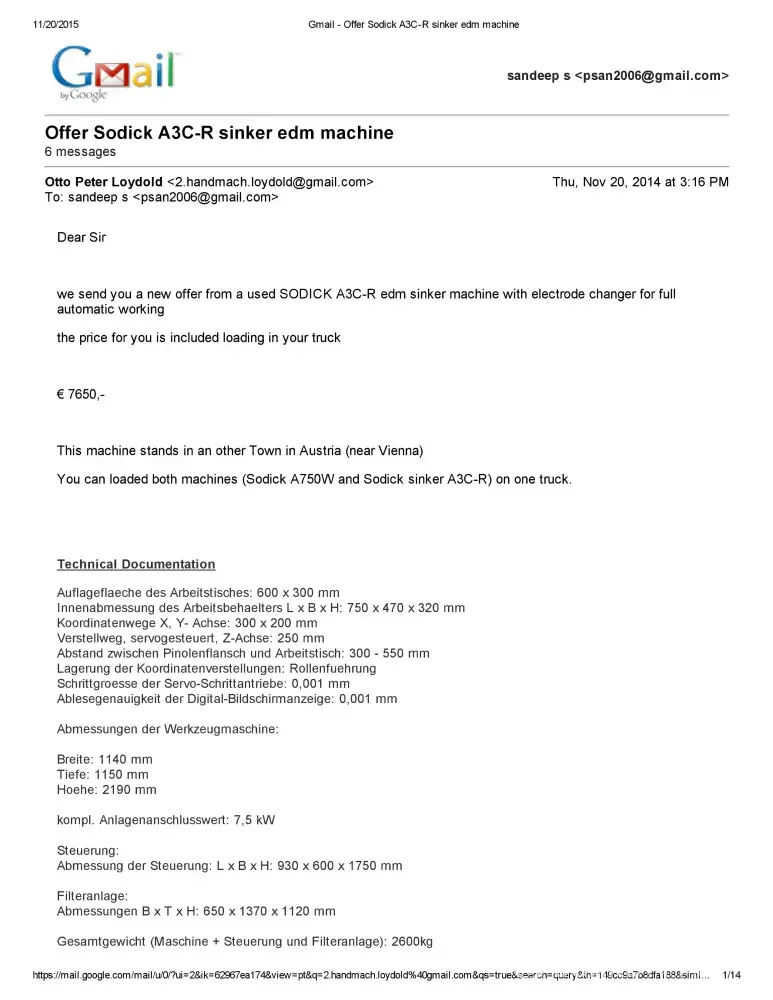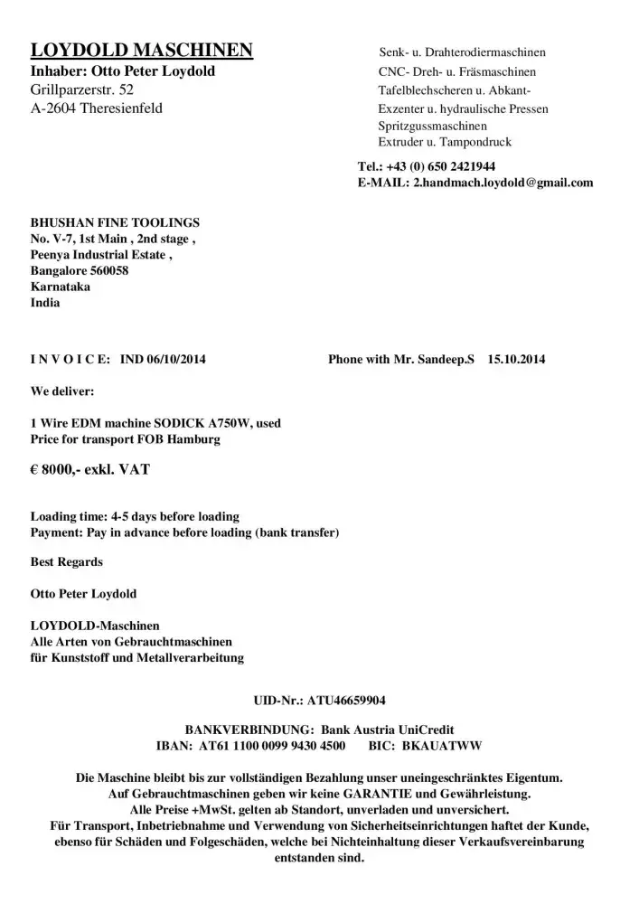 Dear Sir/Madam This is Sandeep S of M/S Bhushan Fine Toolings, India. I would like to bring to your Notice that we have Enquired about Sodick A750 Mark 25 EDM Machine with Mr.Otto Peter Loydold of Loydold Maschinen, Grillparzerstrasse 52 2604 Theresienfeld Austria, ph:+[protected] through www.Machineseeker.com in the Month of October 2014.we had...