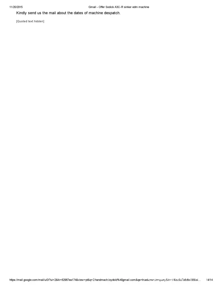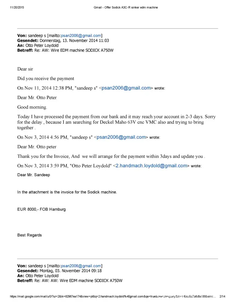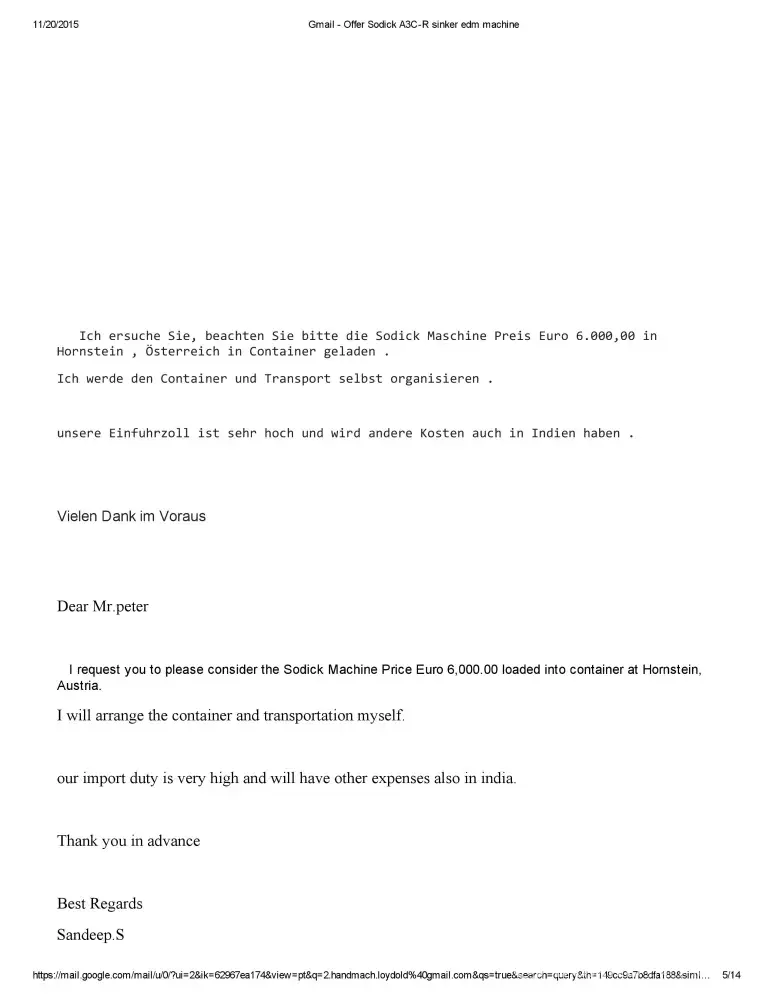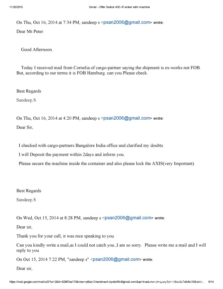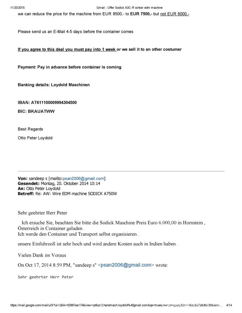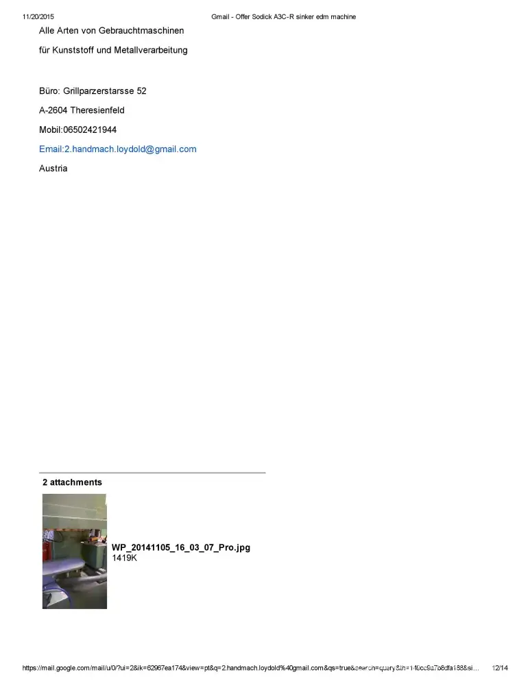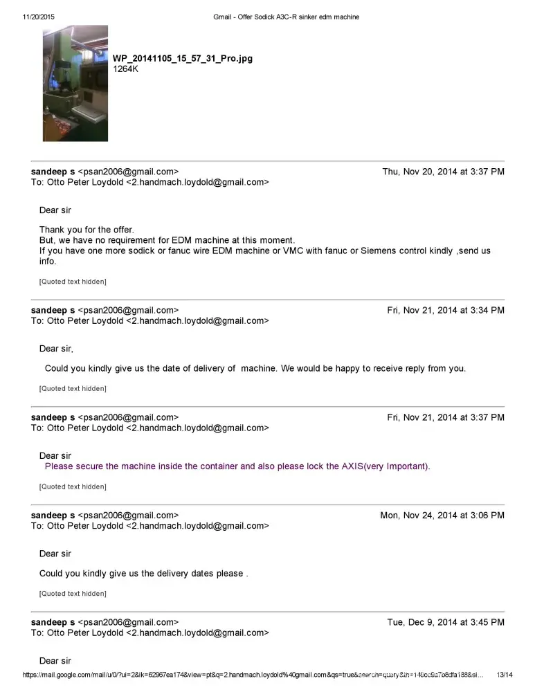 Dear Sir/Madam This is Sandeep S of M/S Bhushan Fine Toolings, India. I would like to bring to your Notice that we have Enquired about Sodick A750 Mark 25 EDM Machine with Mr.Otto Peter Loydold of Loydold Maschinen, Grillparzerstrasse 52 2604 Theresienfeld Austria, ph:+[protected] through www.Machineseeker.com in the Month of October 2014.we had...